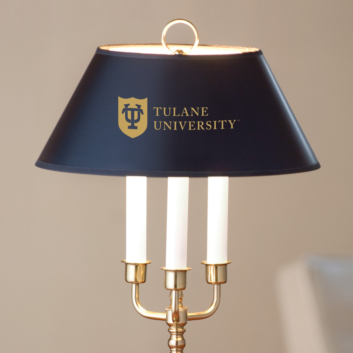 - Tulane Logo in gold on the black parchment shade