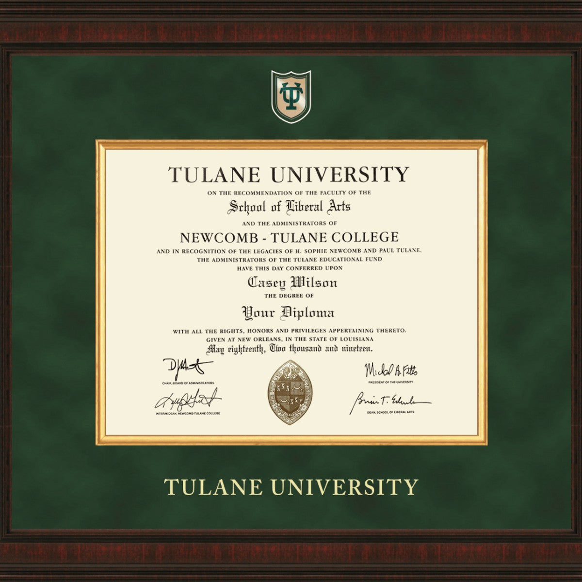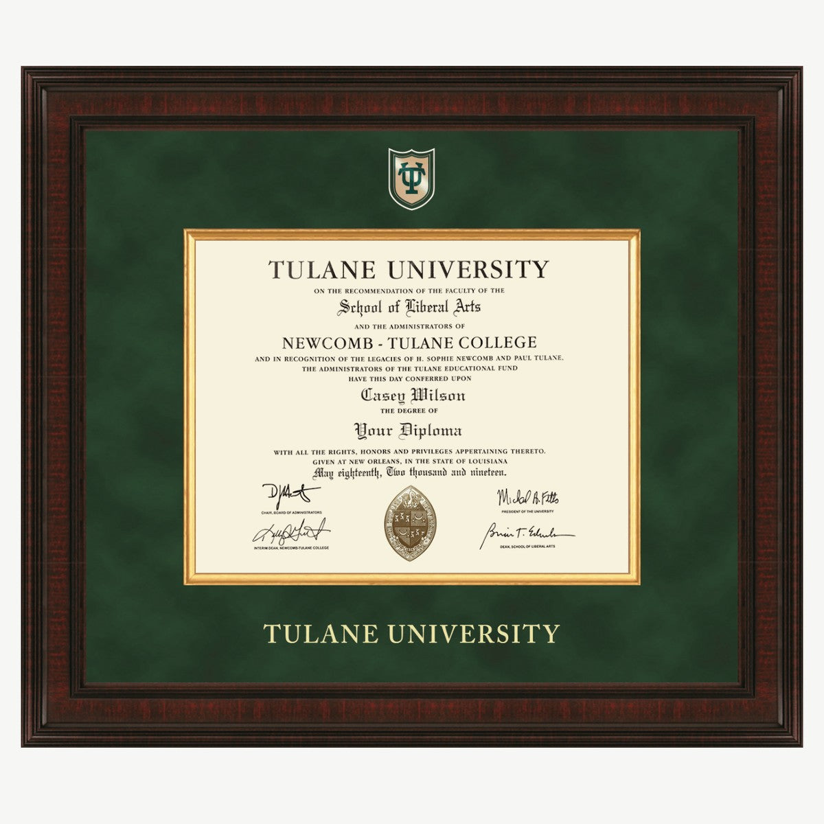 This Tulane University diploma frame is specifically made to showcase and preserve your Tulane University Diploma. Made from solid wood in the USA to meet stringent Library of Congress standards for archival document preservation.