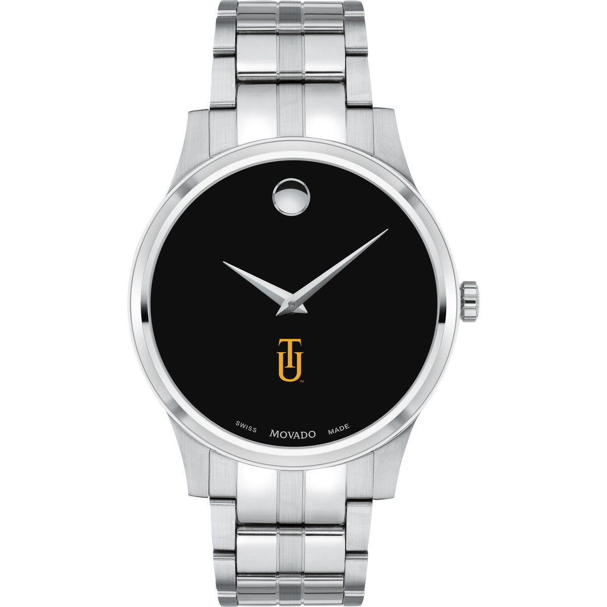 The Tuskegee University Men's Movado Collection watch showcases the iconic Tuskegee Logo in full color on a sophisticated black dial. This classic timepiece, featuring the renowned concave dot symbolizing the sun at high noon, has been a design masterpiece since its creation in 1947. Personalize your watch with free engraving without any delay to your order.