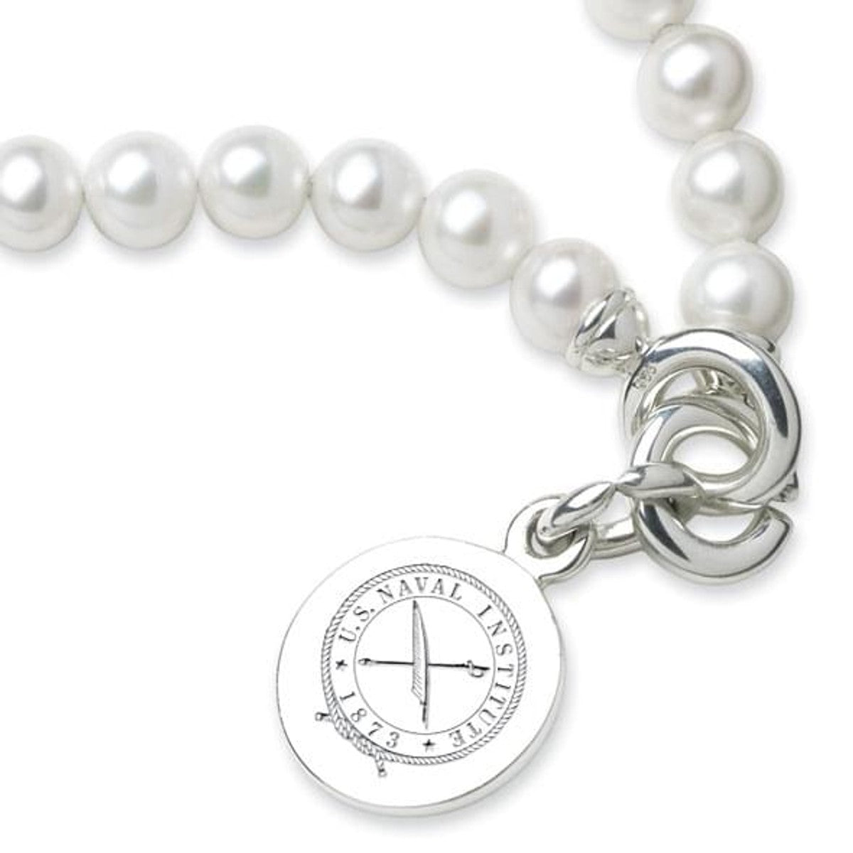 U.S. Naval Institute pearl bracelet and sterling silver USNI charm features USNI crest delicately engraved on front and interlocking "C" clasp.
