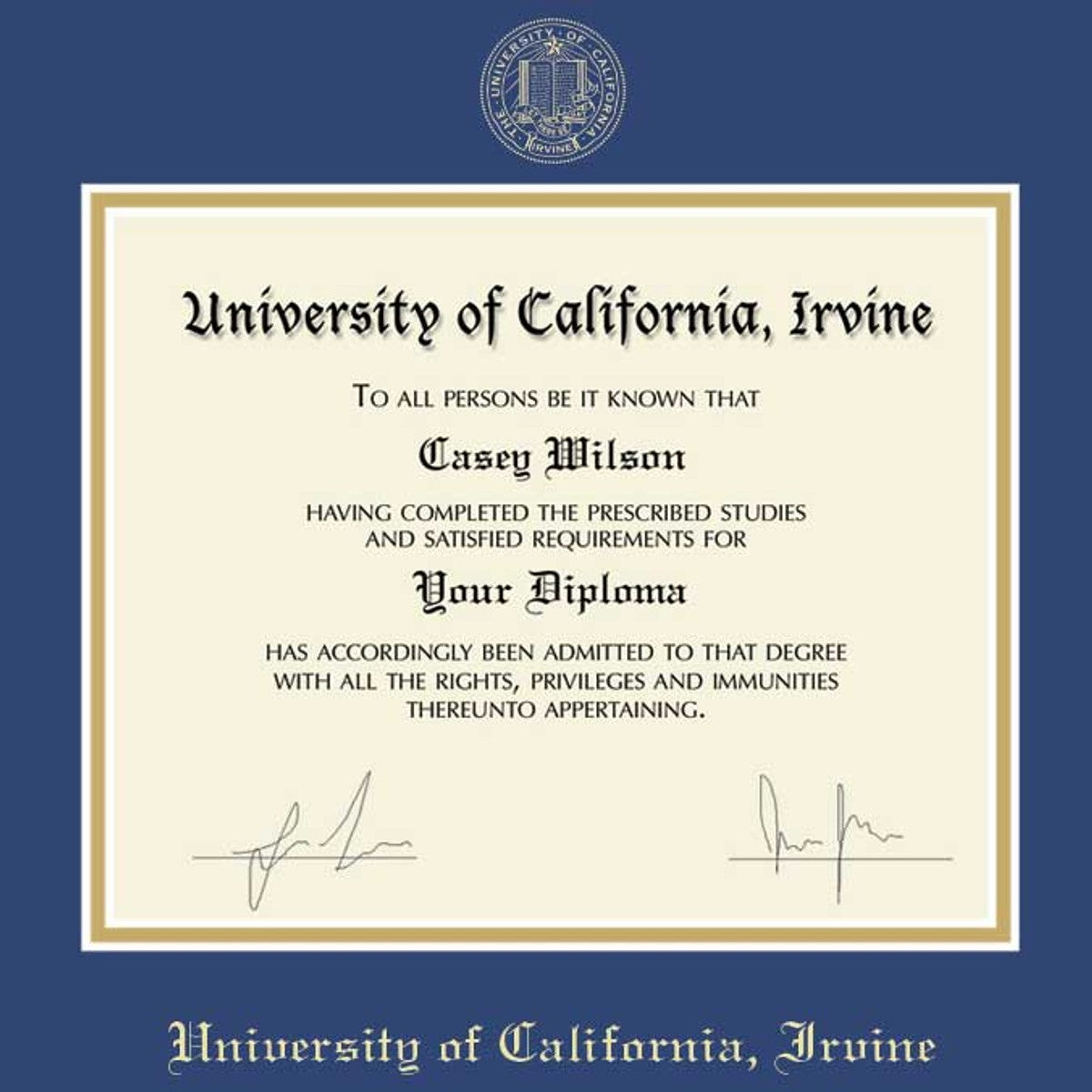 - Gold embossed UC Irvine diploma seal