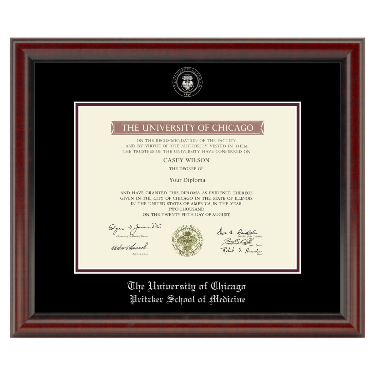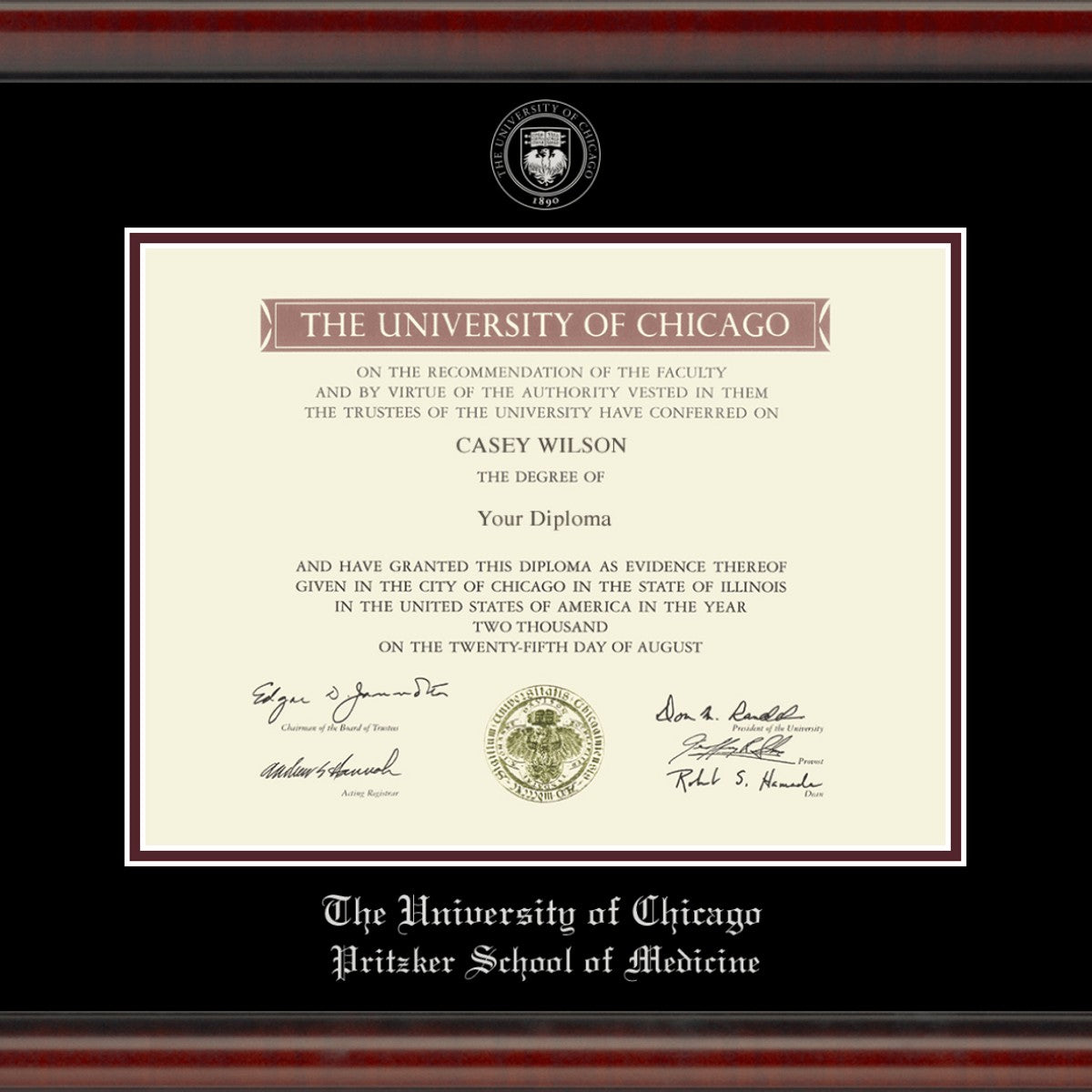 This UChicago Pritzker School of Medicine diploma frame is crafted from solid wood in the USA. Proudly display your Pritzker School of Medicine diploma with museum quality conservation mounting materials to showcase and protect your UChicago Pritzker School of Medicine diploma.