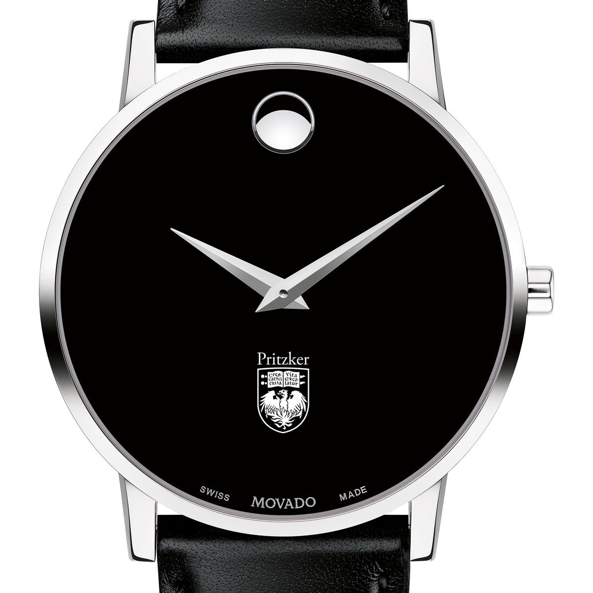 UChicago Pritzker School of Medicine Men's Movado Museum watch features the Pritzker School of Medicine logo in full color at 6 o'clock on black dial. Created in 1947, the iconic concave dot symbolizes the sun at high-noon. Complimentary personal engraving.