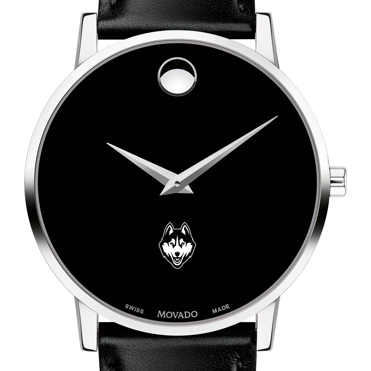 University of Connecticut Men's Movado Museum watch features the UConn Logo in full color at 6 o'clock on black dial. Created in 1947, the iconic concave dot symbolizes the sun at high-noon. Complimentary personal engraving.