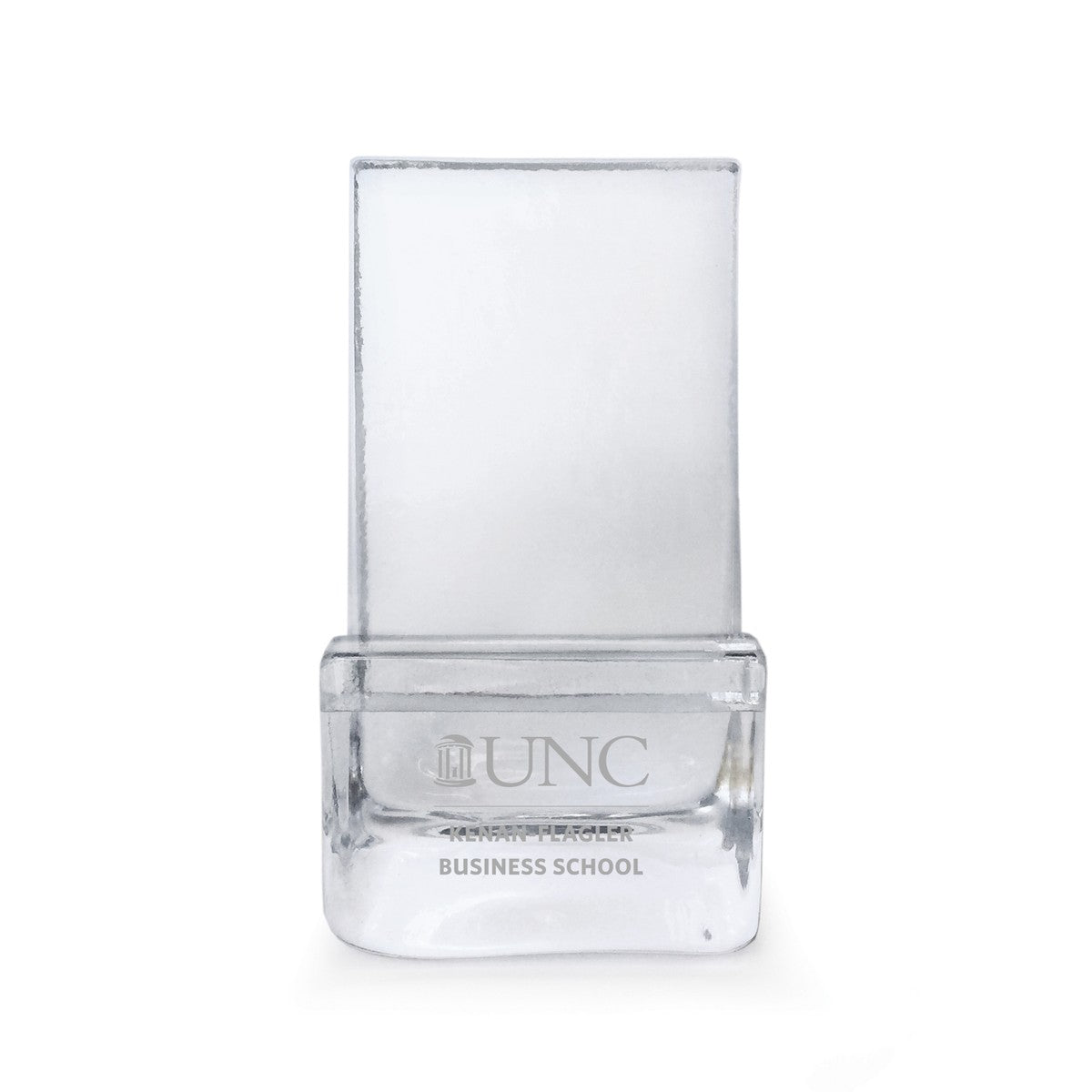 This handcrafted UNC Kenan–Flagler Business School Glass Phone Holder is the perfect addition to your work or home environment. Formed from only the finest clear glass, the UNC Kenan-Flagler logo is distinctly etched on the front.