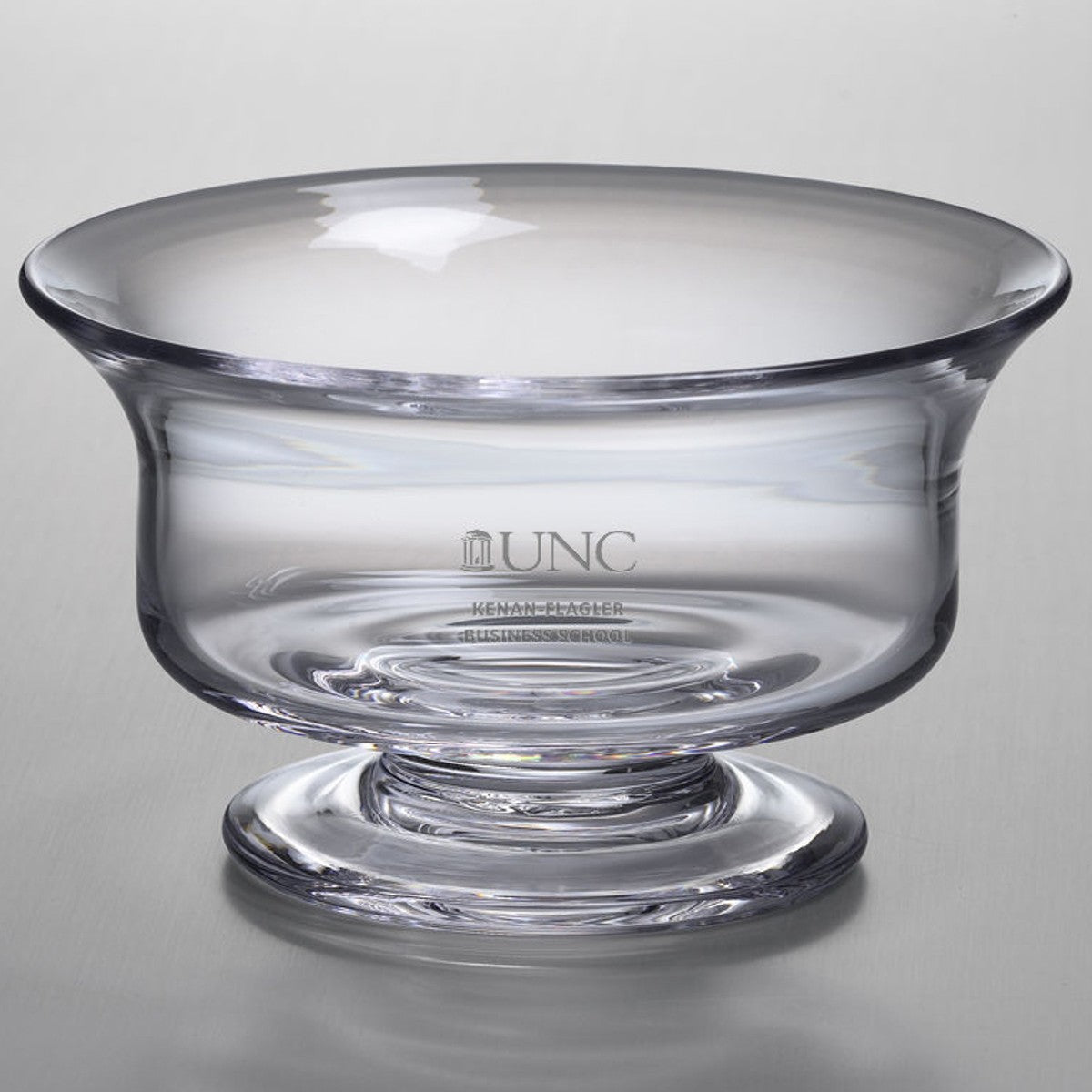 The UNC Kenan–Flagler Business School Small Glass Presentation Bowl, with the UNC Kenan-Flagler logo beautifully etched into the hand-crafted glass is a great gift. The traditional style of the bowl complements any UNC Kenan-Flagler home.