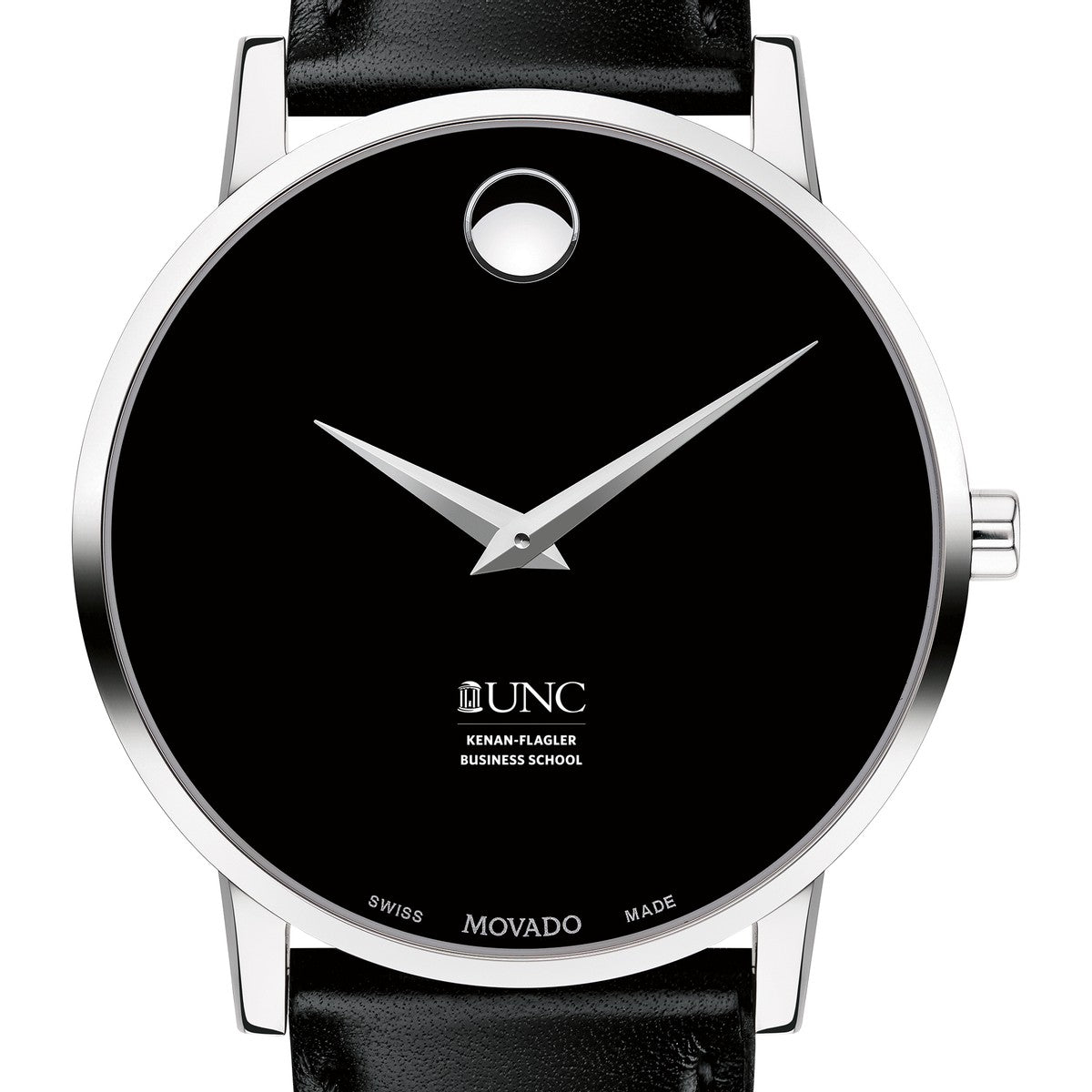 UNC Kenan–Flagler Business School Men's Movado Museum watch features the UNC Kenan-Flagler logo in full color at 6 o'clock on black dial. Created in 1947, the iconic concave dot symbolizes the sun at high-noon. Complimentary personal engraving.