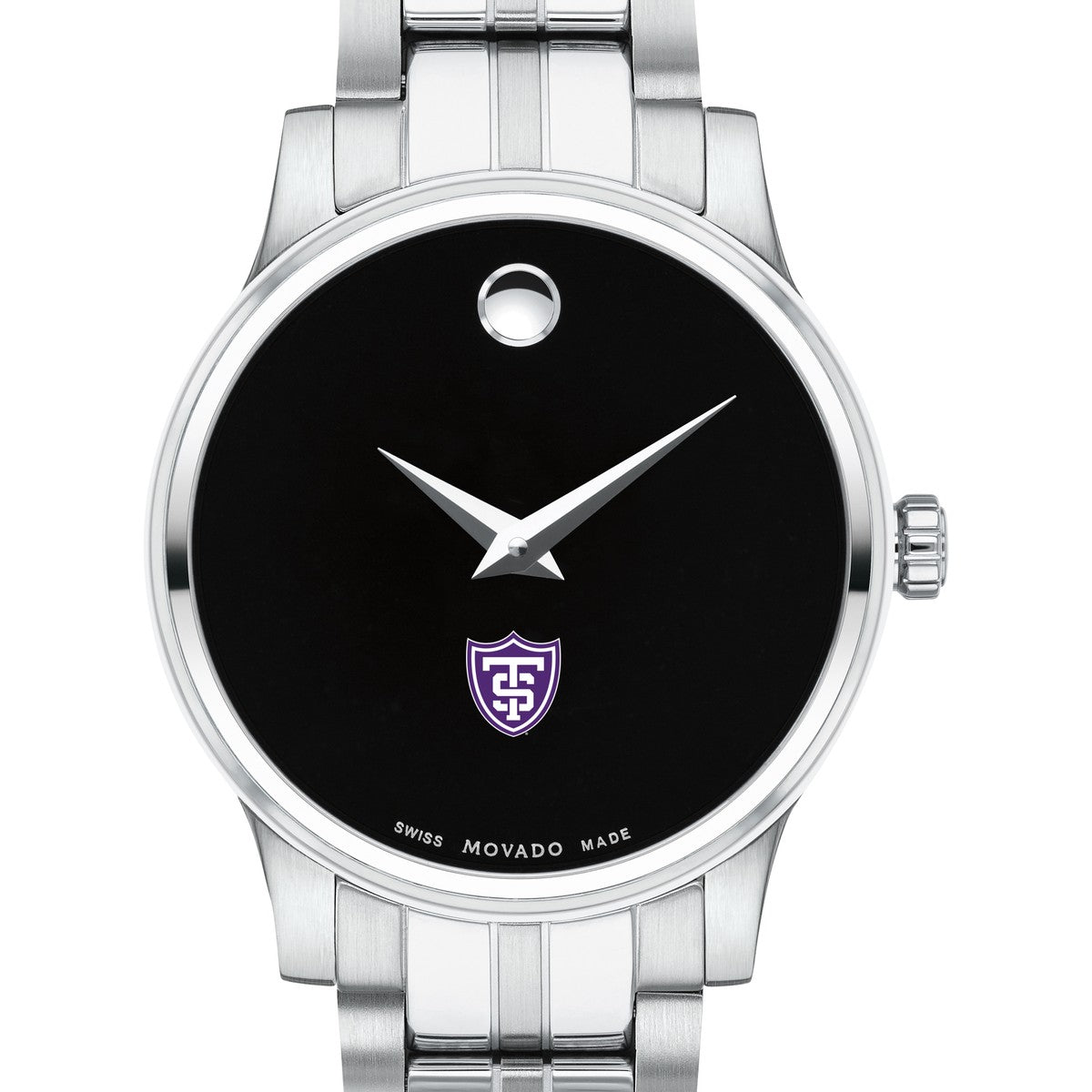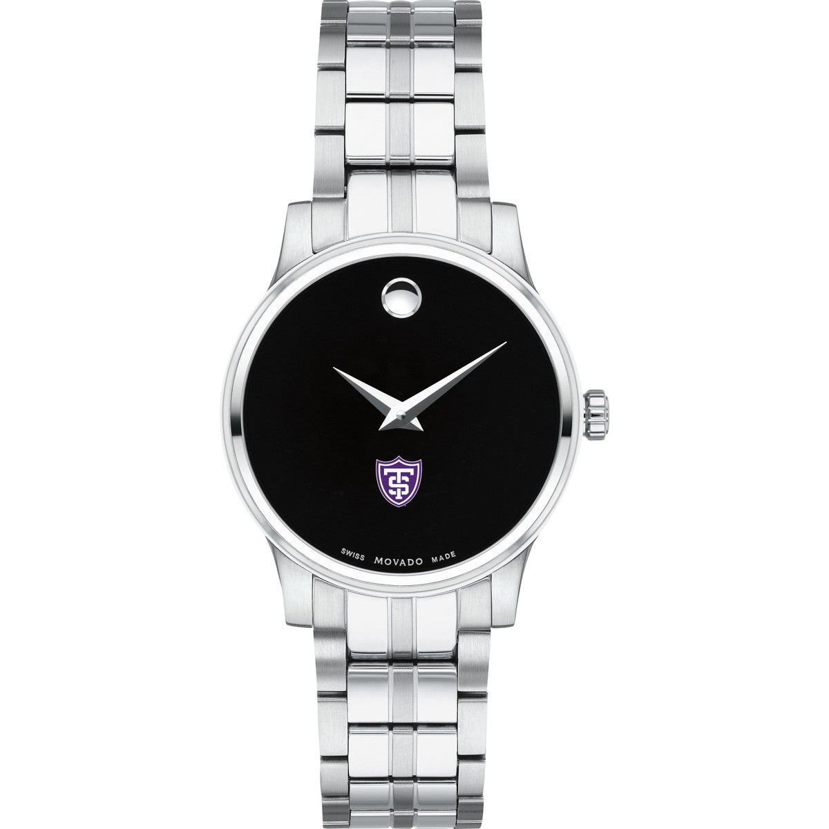 The University of St. Thomas Women's Movado Collection watch showcases the iconic St. Thomas Logo in full color against a sophisticated black dial. This elegant timepiece, featuring the renowned concave dot symbolizing the sun at high noon, embodies timeless style. Personalize your watch with free engraving without any delay to your order.