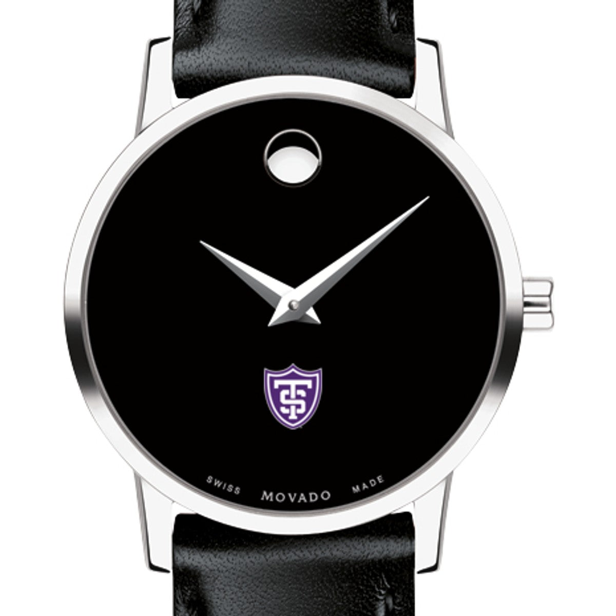 University of St. Thomas Women's Movado Museum watch features the St. Thomas Logo in full color at 6 o'clock on black dial. Created in 1947, the iconic concave dot symbolizes the sun at high-noon. Complimentary personal engraving.
