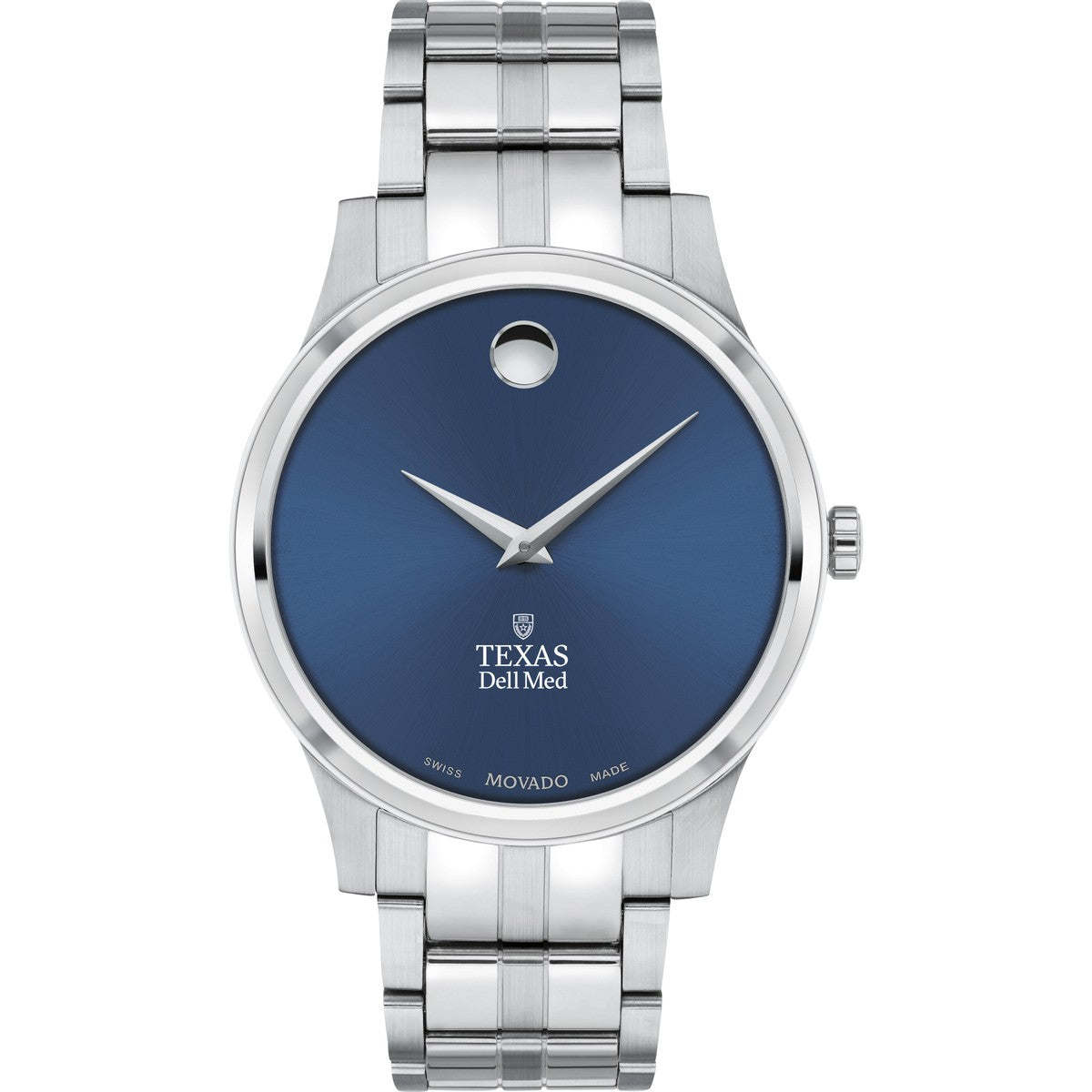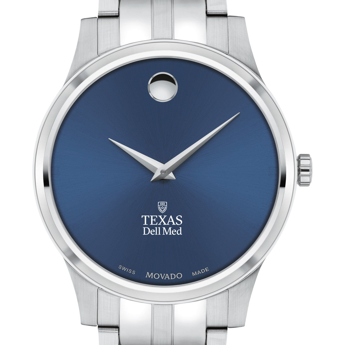 The The University of Texas at Austin Dell Medical School Men's Movado Collection watch boasts a striking blue dial featuring the iconic Texas Dell Med logo in full color. This timeless timepiece, renowned for its concave dot representing the sun at high noon, has been a symbol of elegance since its inception in 1947. Make it uniquely yours with free engraving without affecting order processing time.