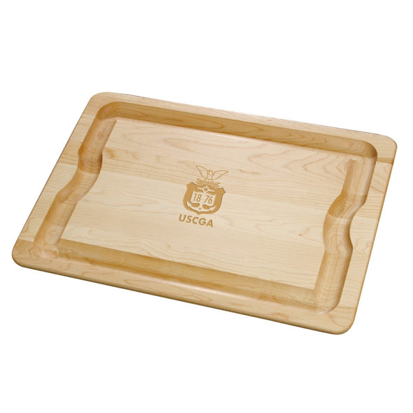 The US Coast Guard Academy Maple Cutting Board is crafted from sturdy Maple with undercut handles and a wide groove to collect juices while you carve. Ample surface featuring the USCGA Logo is suitable for both cutting and serving.