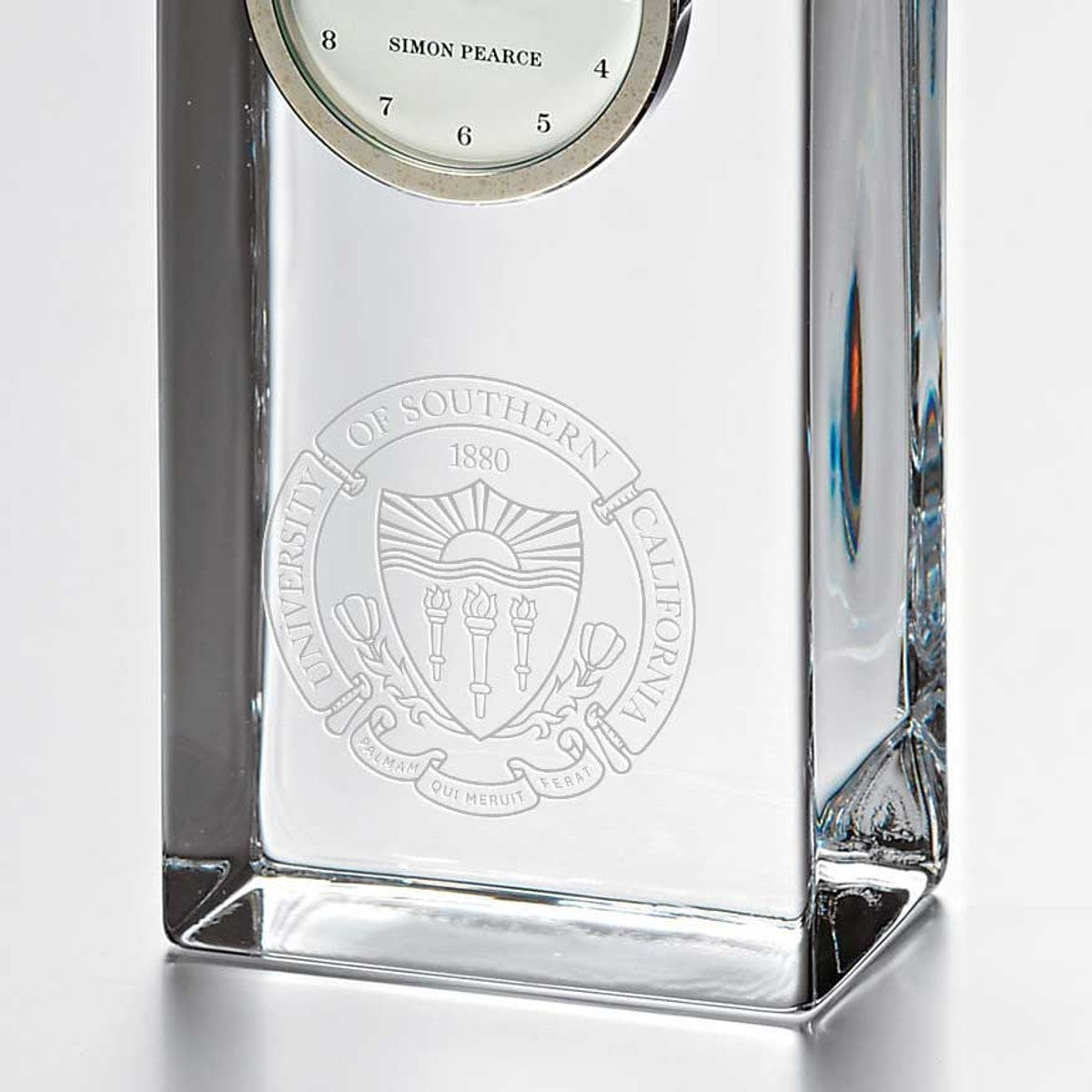 The USC Tall Glass Desk Clock stands proudly on any surface, distinctly etched with the USC logo. The clock showcases a traditional numbered face with a sweep hand to count the seconds.