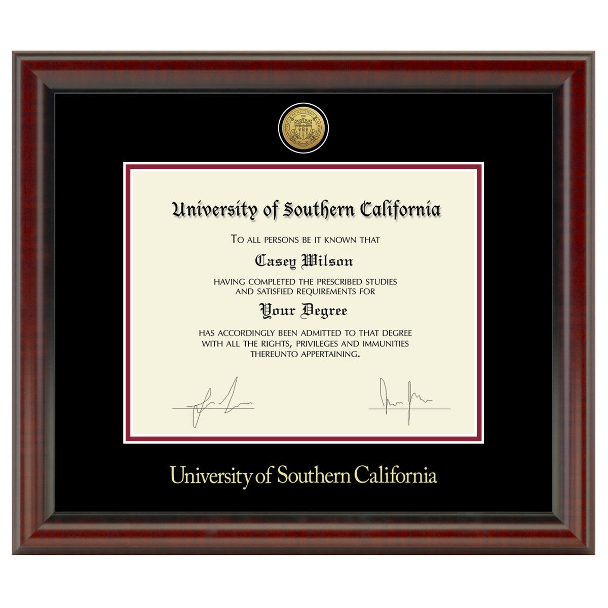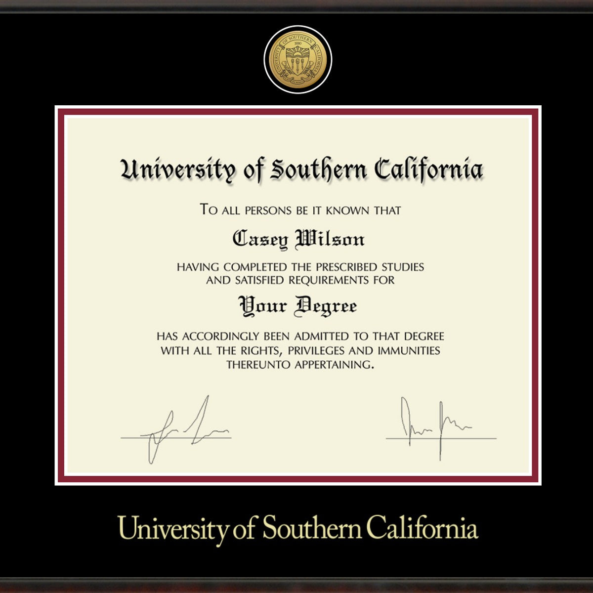 Highlighted by the gold medallion above the University of Southern California diploma, this frame is sure to stand out in your home or office. Crafted in the USA of the finest hardwood with museum quality conservation mounting materials to showcase and protect your diploma.
