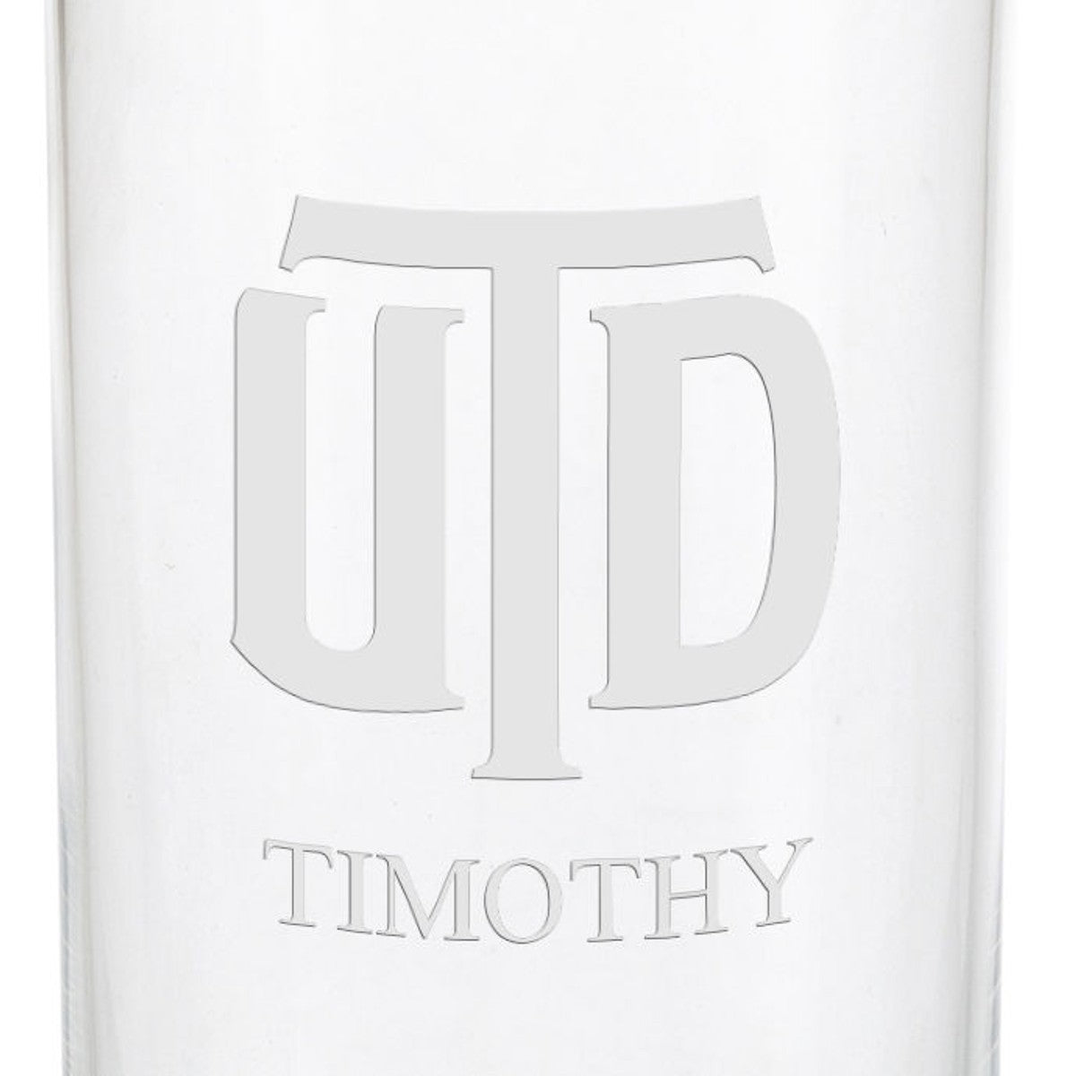 University of Texas at Dallas iced beverage glasses have the UT Dallas Logo deep-etched on each glass. Generously proportioned 16-ounce glasses are a pleasure to hold.