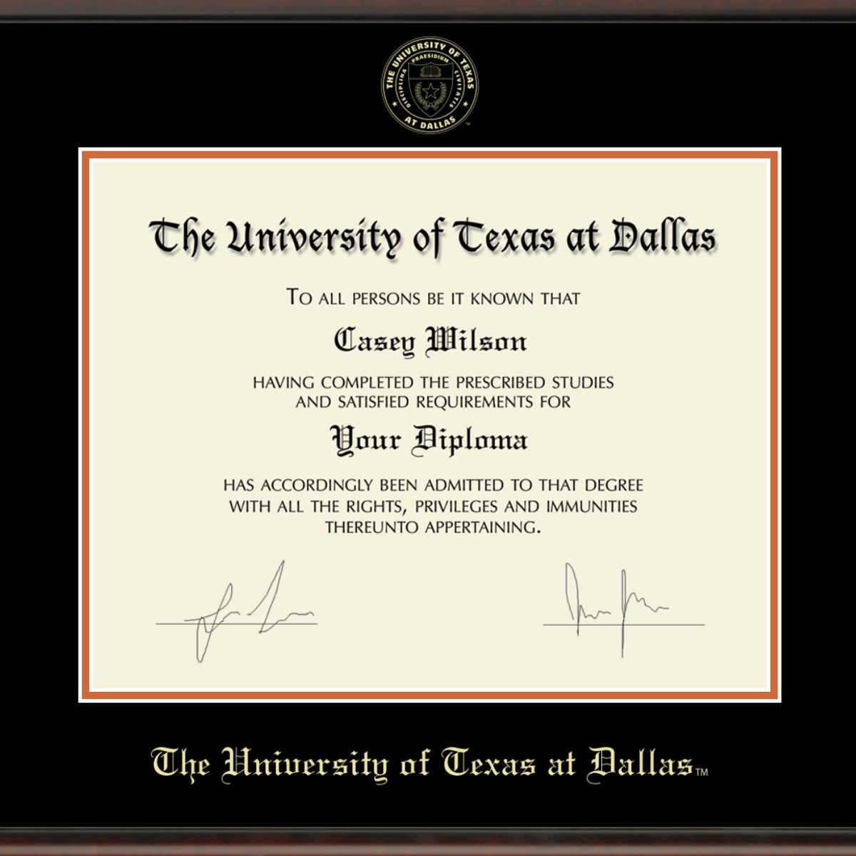 - Gold embossed UT Dallas diploma seal