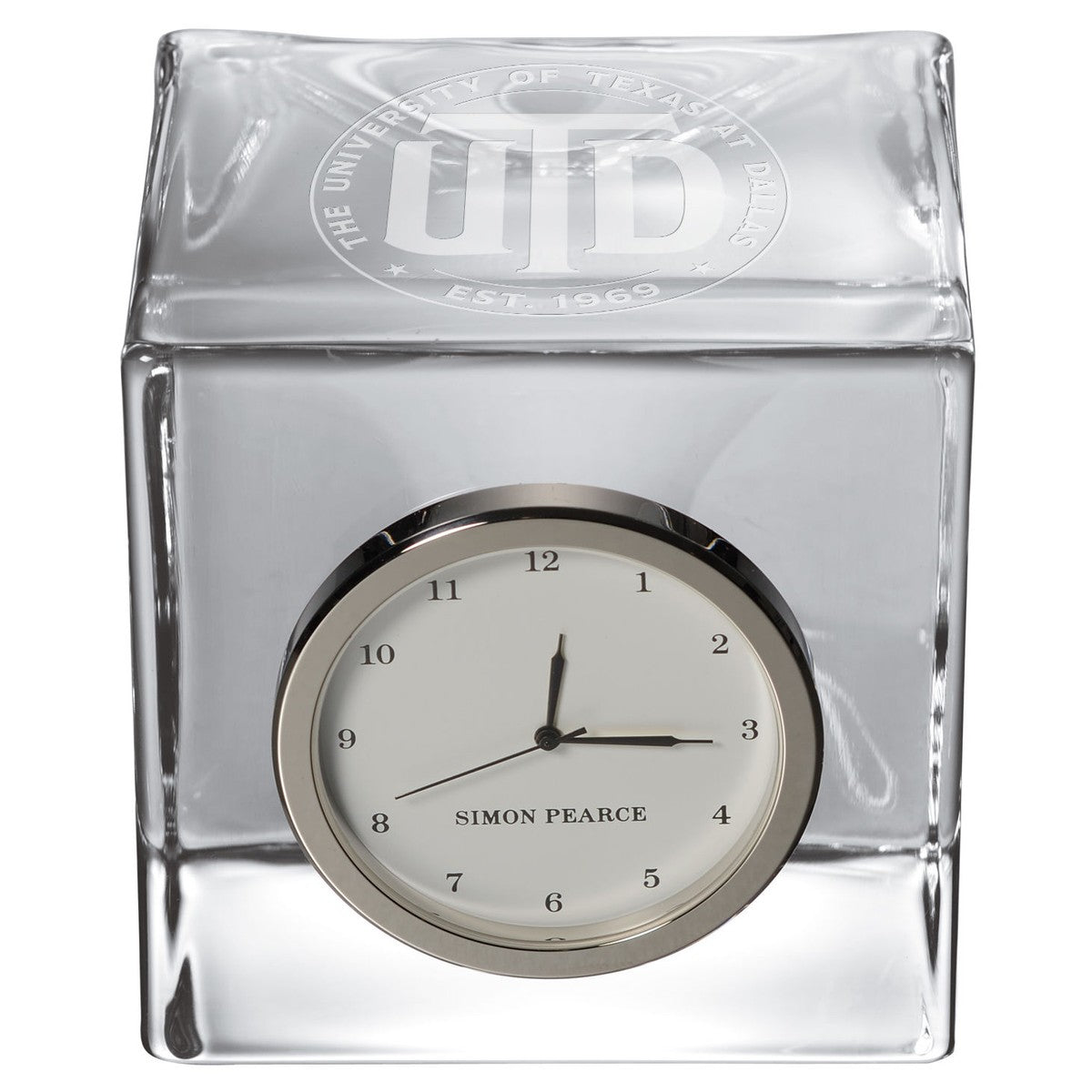 University of Texas at Dallas Glass Desk Clock is distinctly etched with the UT Dallas Logo, and is a great addition to any surface. The clock includes a traditional numbered face with a sweep hand to count the seconds.