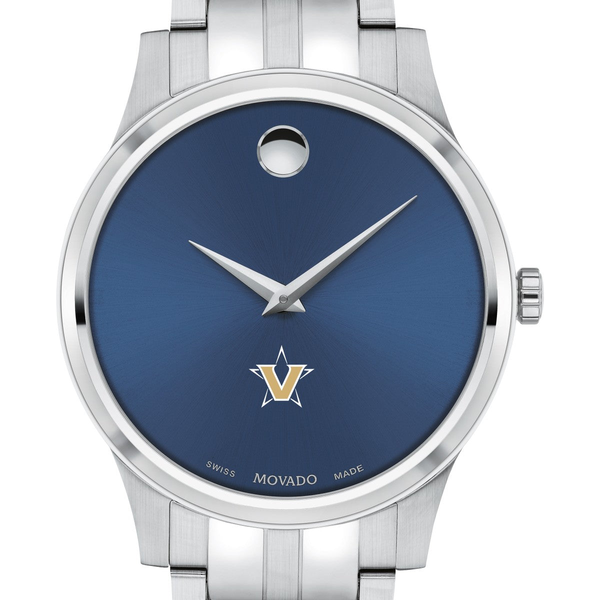 The Vanderbilt University Men's Movado Collection watch boasts a striking blue dial featuring the iconic Vanderbilt Logo in full color. This timeless timepiece, renowned for its concave dot representing the sun at high noon, has been a symbol of elegance since its inception in 1947. Make it uniquely yours with free engraving without affecting order processing time.