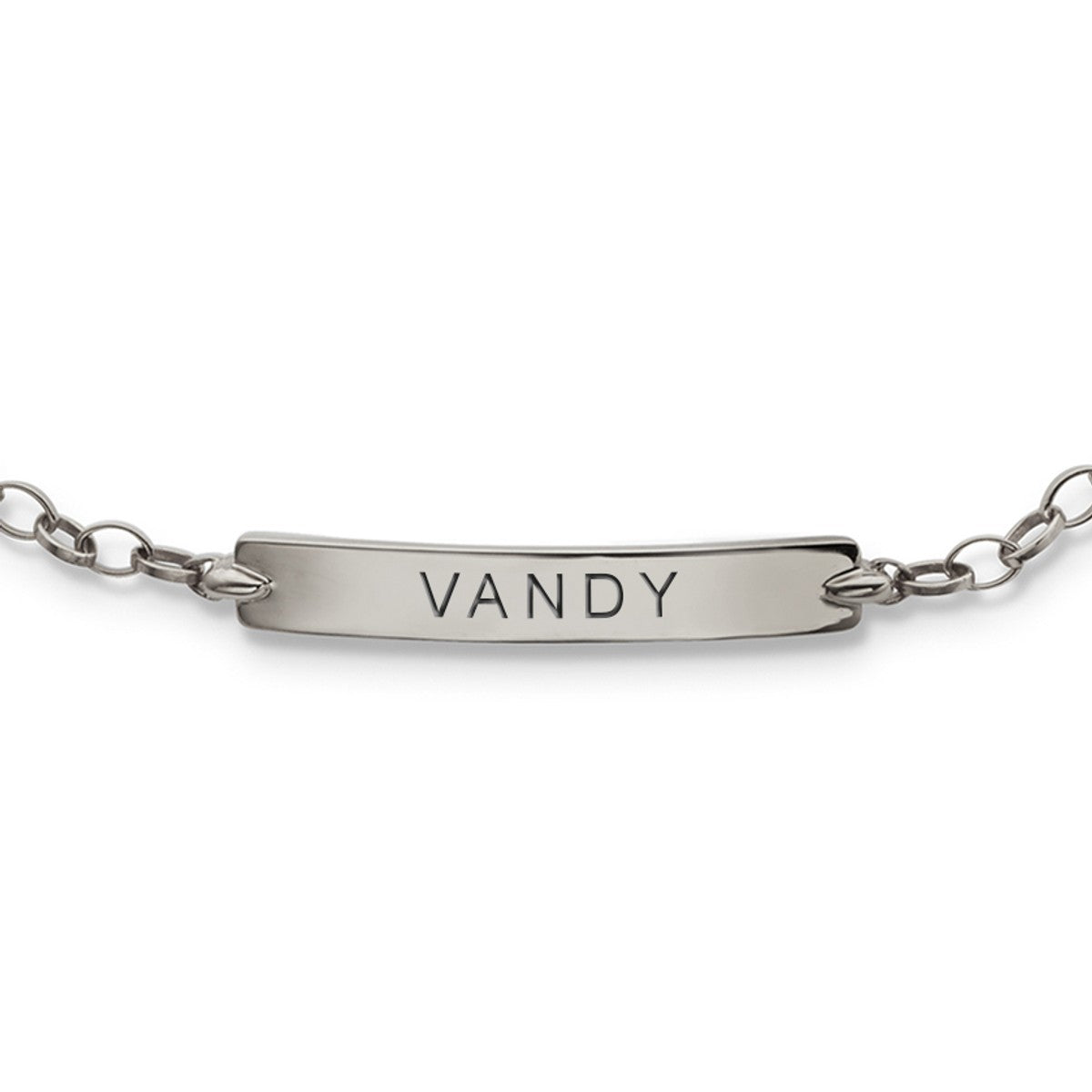 A feminine, delicate bracelet in sterling silver as appropriate for evening wear as day. "VANDY" engraved on slim banner accentuates the elegance.