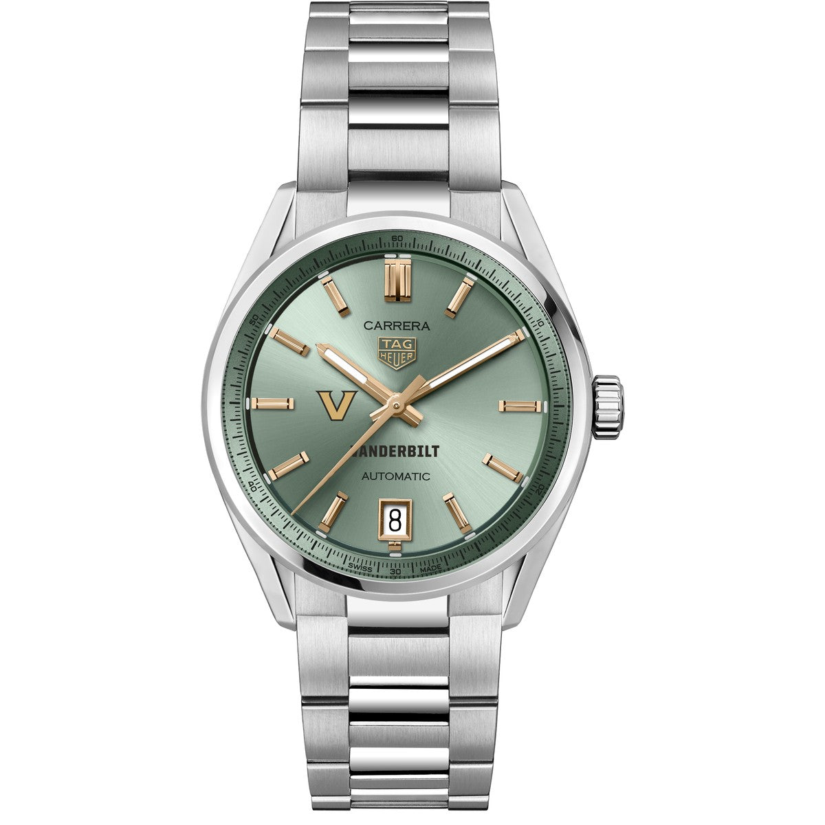 Explore the Vanderbilt Women's TAG Heuer Steel Carrera watch, featuring the Vanderbilt Logo on a pastel green sunray brushed dial with 18K 5N rose gold-plated hands and indexes. Equipped with the Calibre 7 movement, it combines style and superior functionality. Complimentary personal engraving.