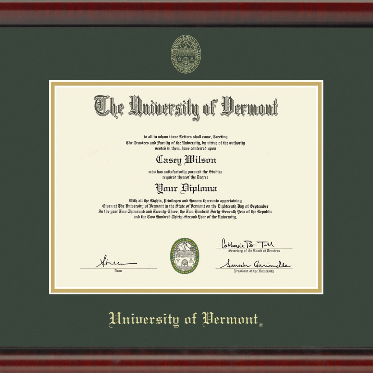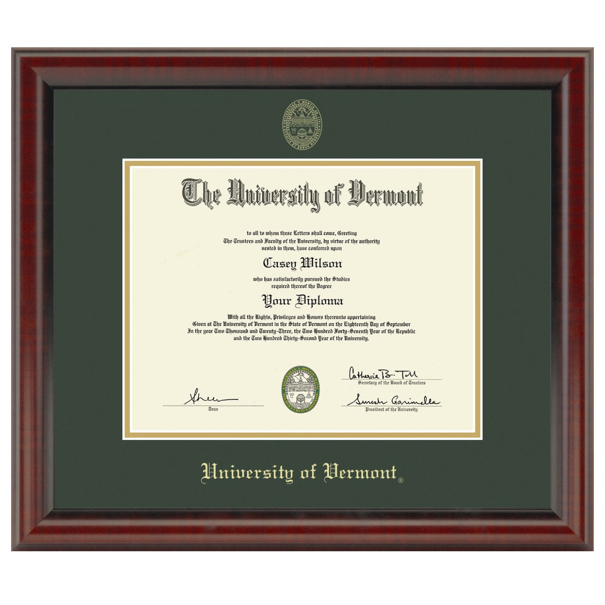 This University of Vermont diploma frame is crafted from solid wood in the USA. Proudly display your Vermont diploma with museum quality conservation mounting materials to showcase and protect your University of Vermont diploma.