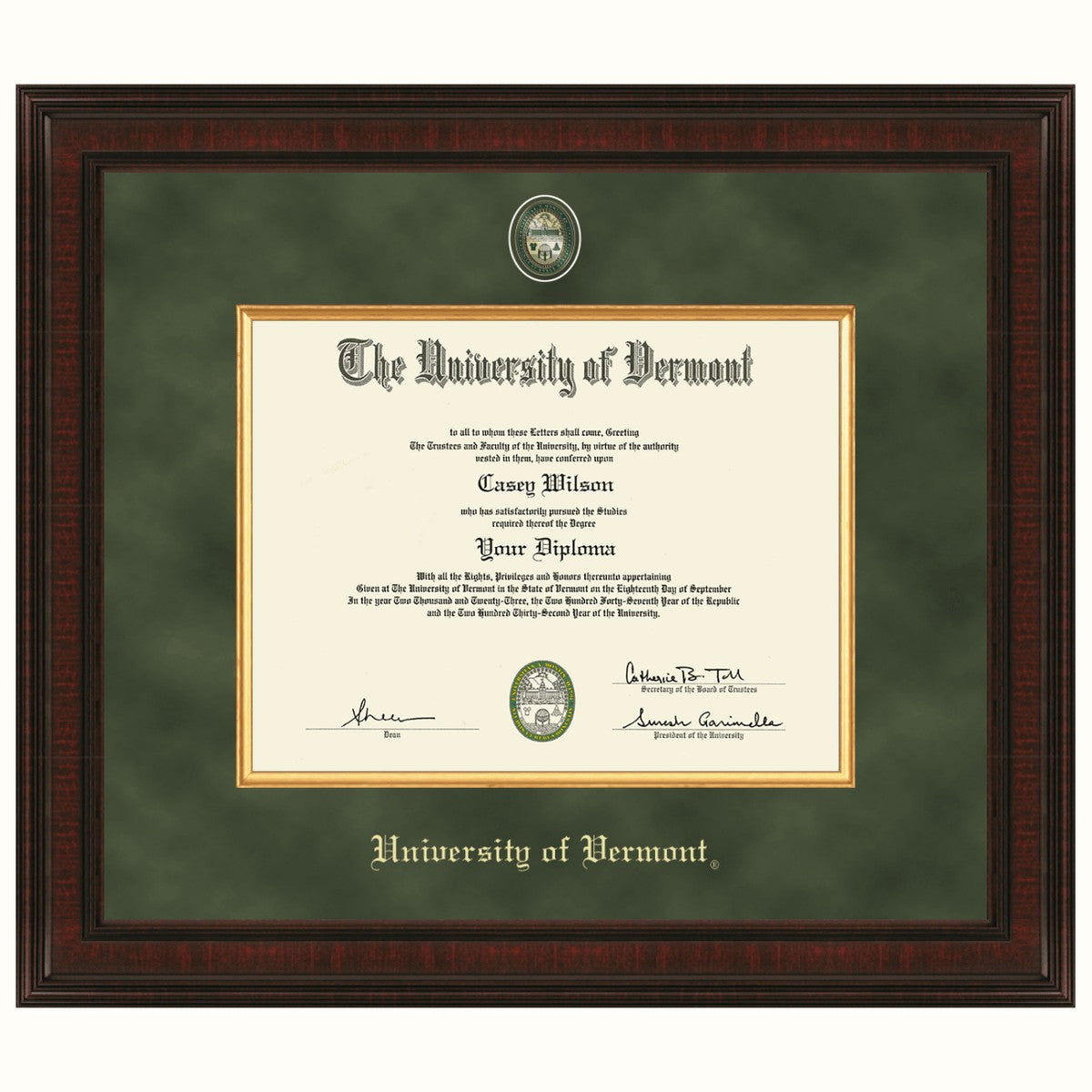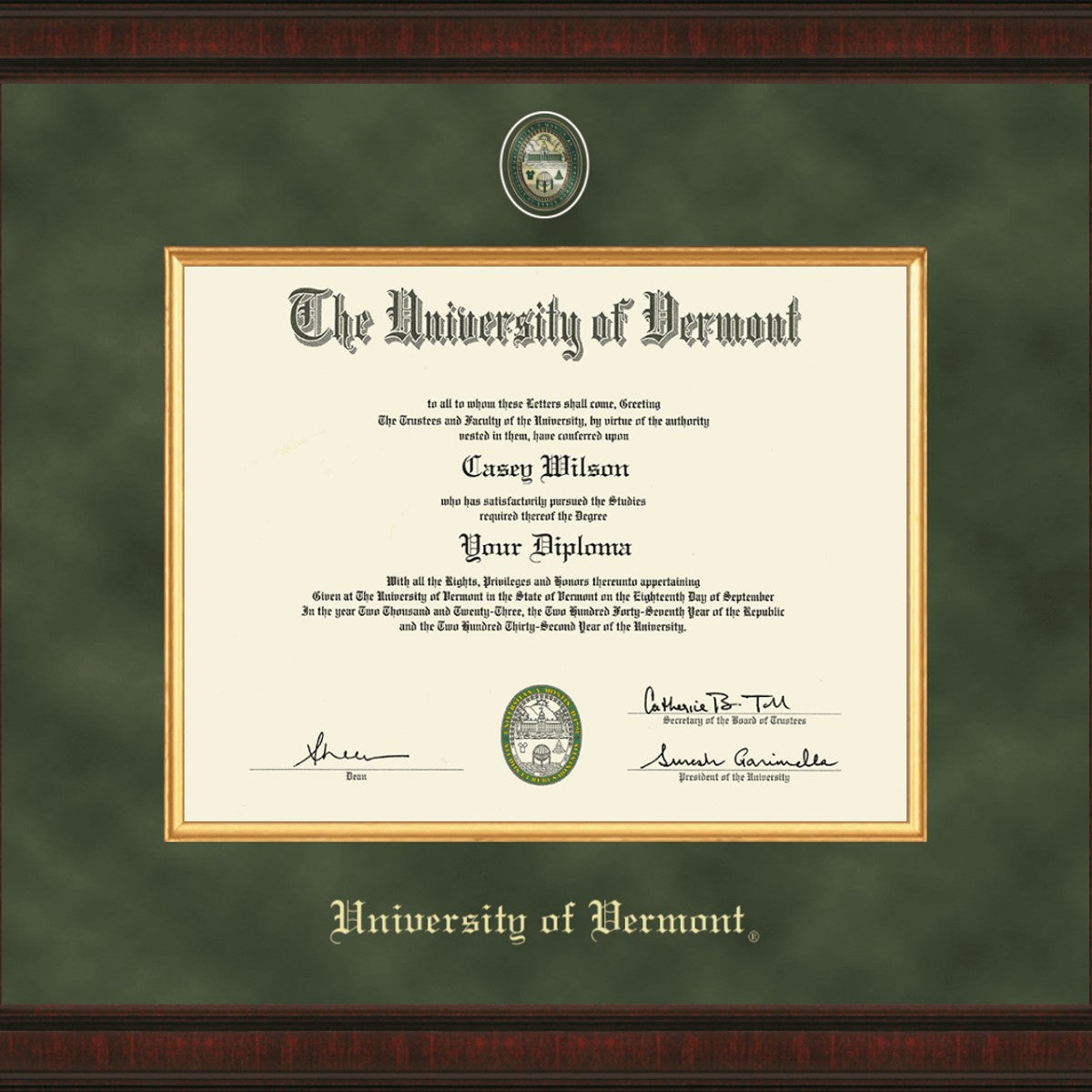 This University of Vermont diploma frame is specifically made to showcase and preserve your University of Vermont Diploma. Made from solid wood in the USA to meet stringent Library of Congress standards for archival document preservation.