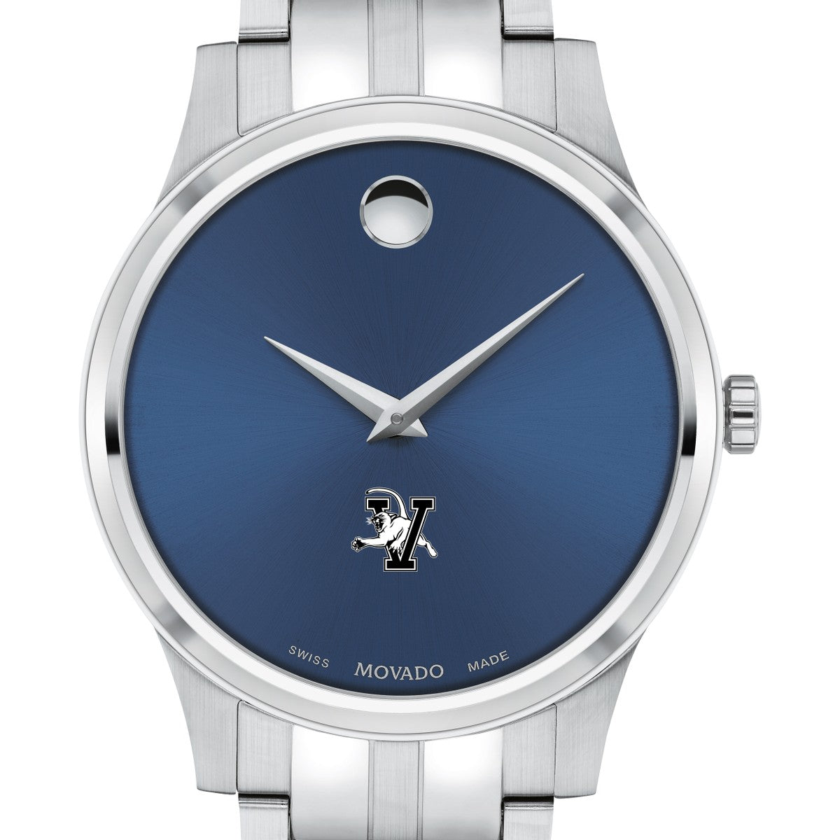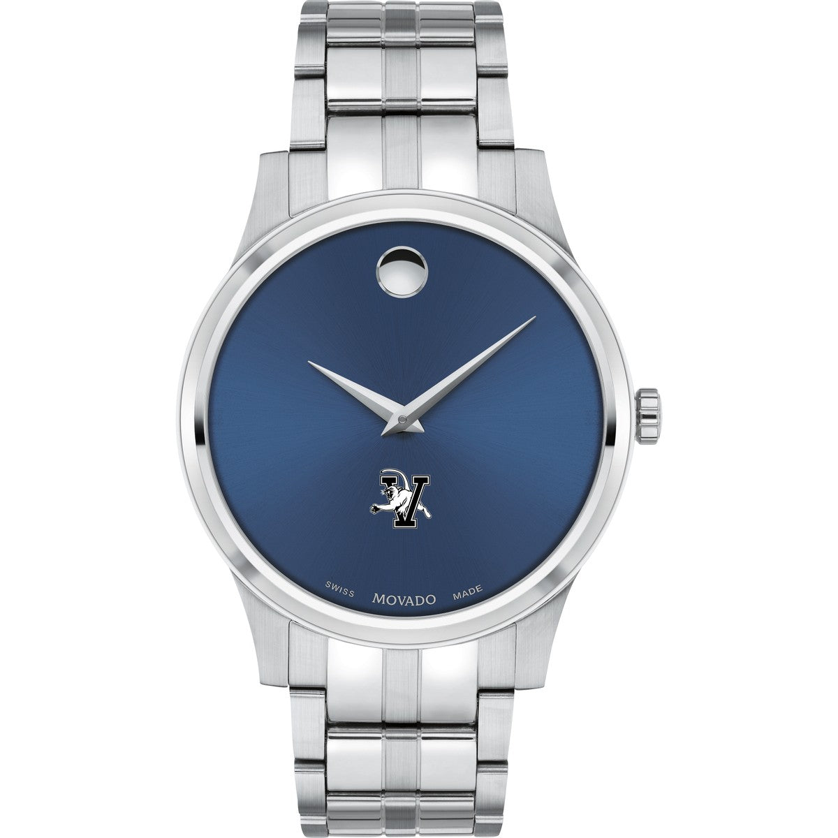 The University of Vermont Men's Movado Collection watch boasts a striking blue dial featuring the iconic Vermont Logo in full color. This timeless timepiece, renowned for its concave dot representing the sun at high noon, has been a symbol of elegance since its inception in 1947. Make it uniquely yours with free engraving without affecting order processing time.