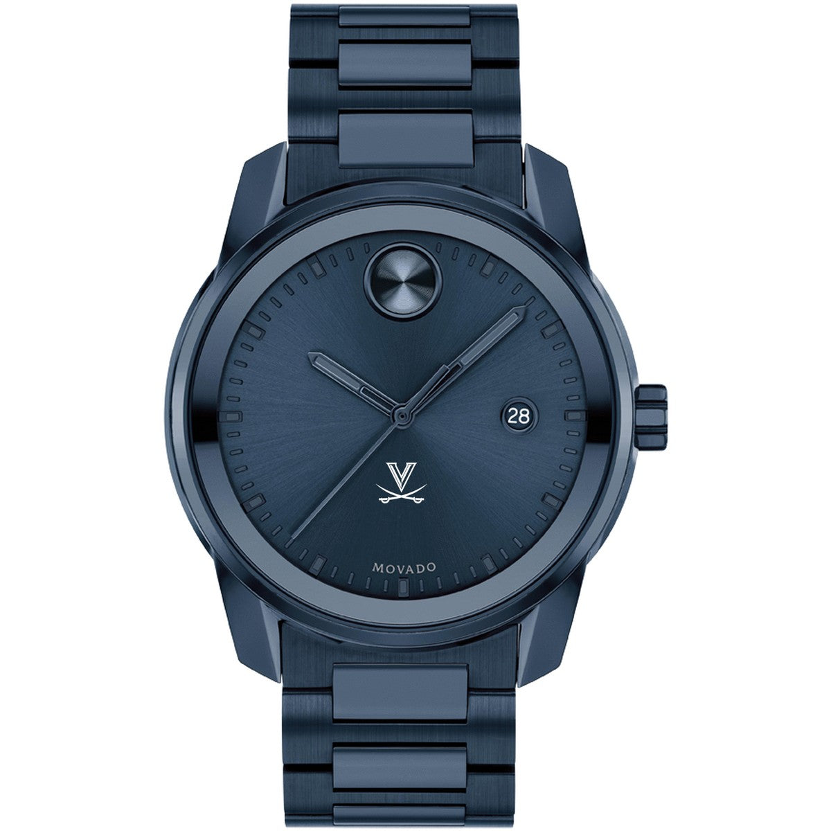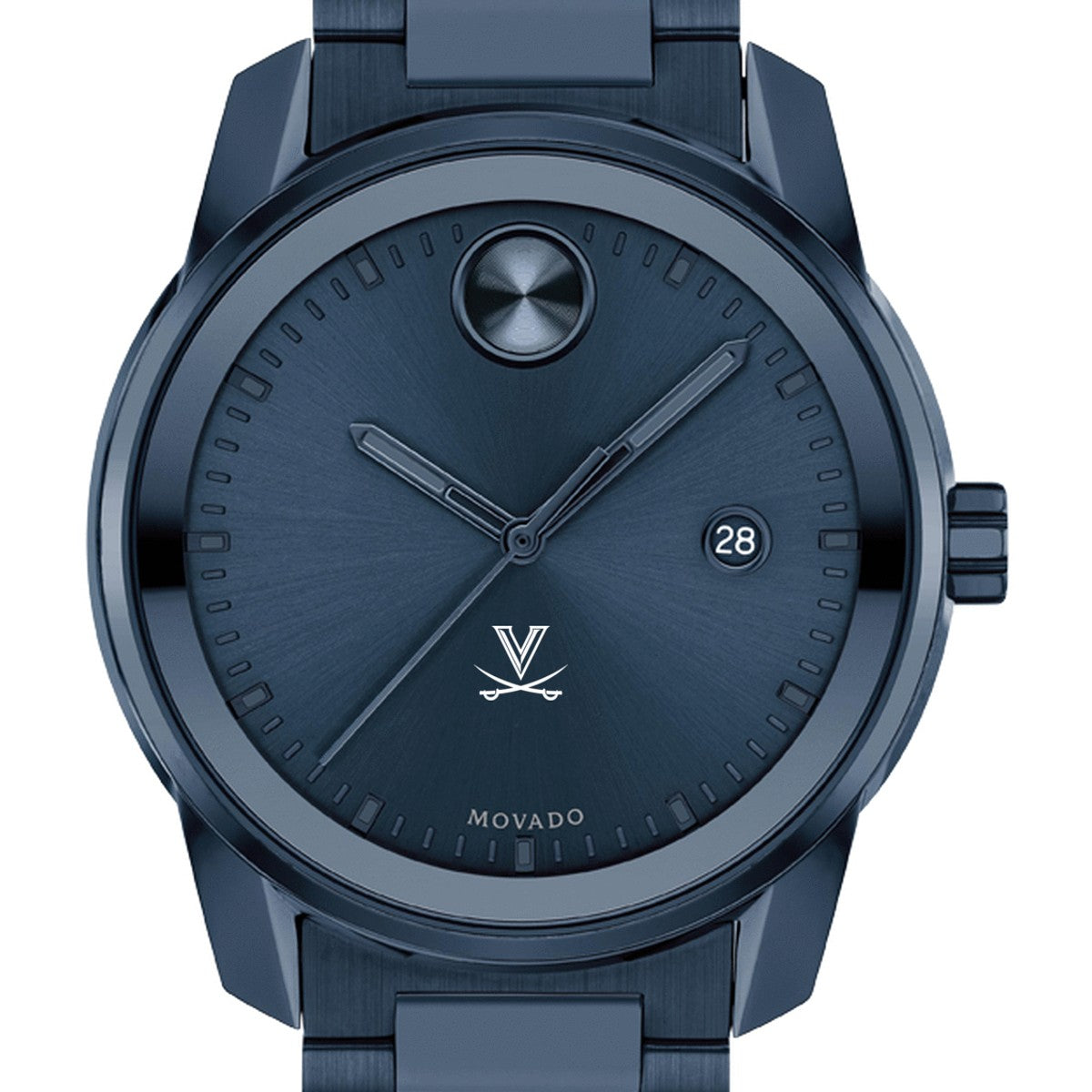 University of Virginia Men's Movado BOLD Blue Ion with Date Window features high-tech materials, bold signature dot, and the sophistication of Movado with the UVA Logo. Complimentary personal engraving.