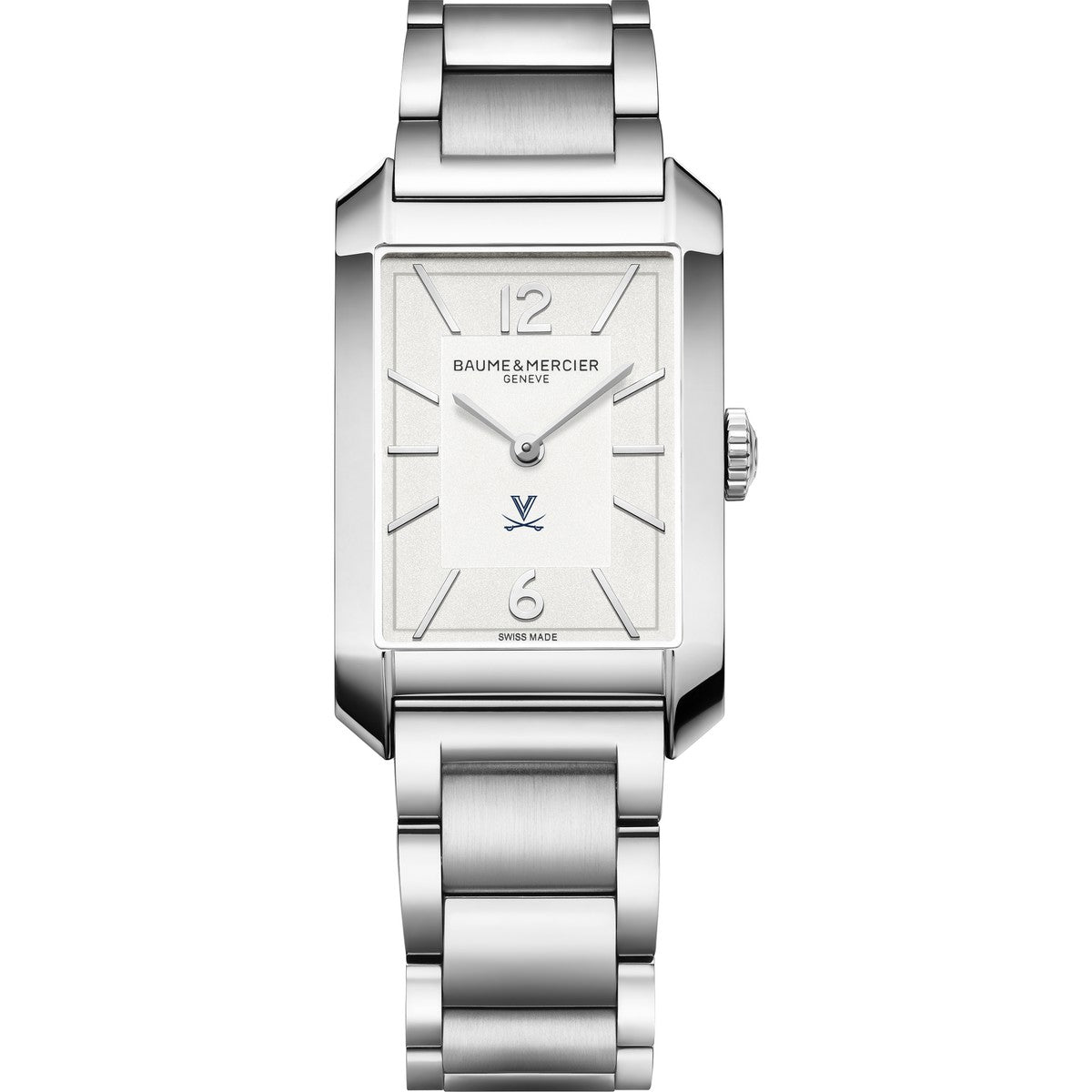 The UVA Men's Baume et Mercier Hampton Watch combines contemporary design with timeless elegance. Its silver opaline dial, featuring the UVA logo, rhodium-plated hands, and stainless steel bracelet make this rectangular timepiece a refined choice for any stylish man. Complimentary personal engraving.