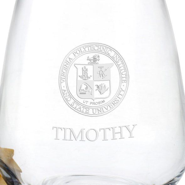 Contemporary Virginia Tech stemless wine glasses bring an elegant touch to your table or bar. The Virginia Tech Logo is deep-etched on each glass.