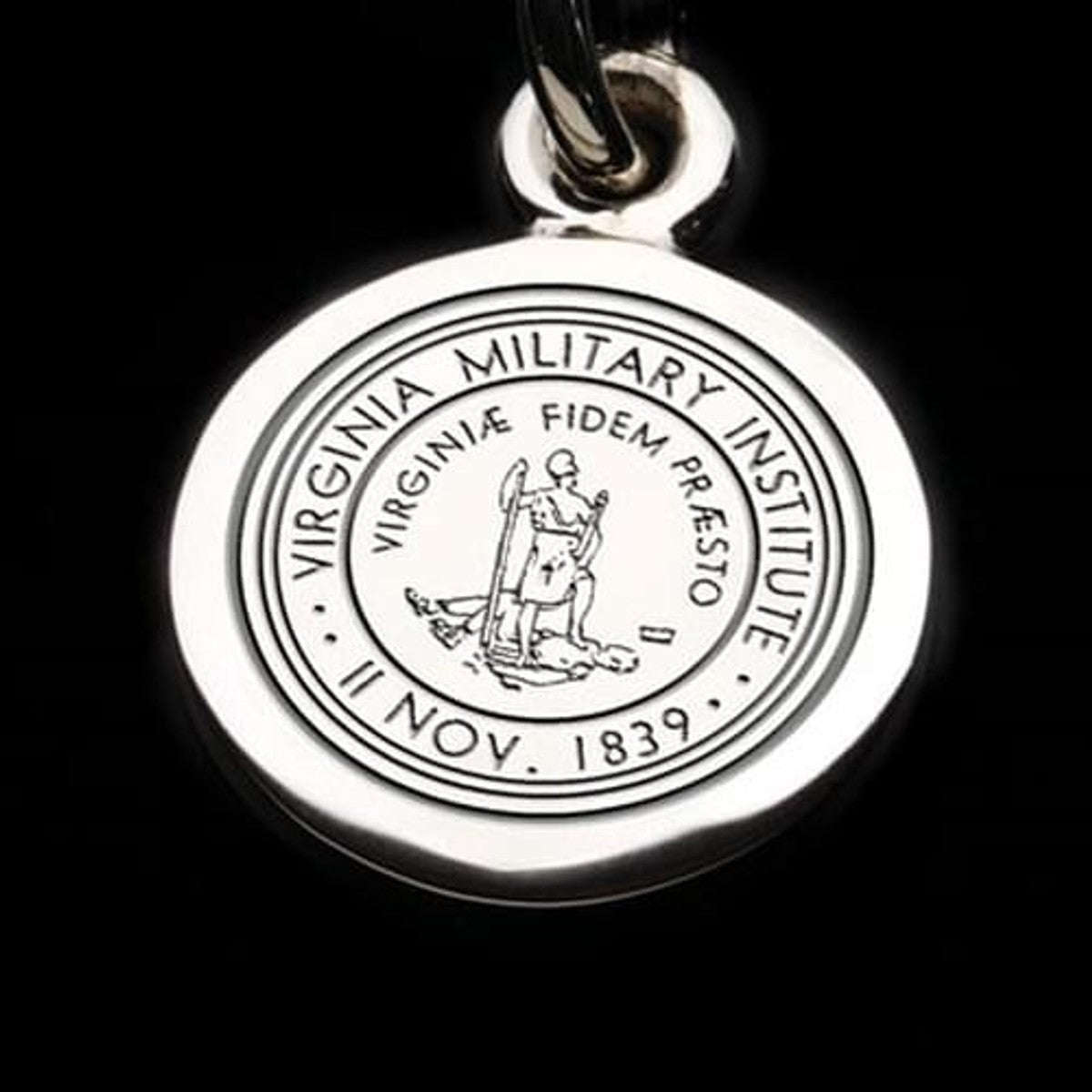 Virginia Military Institute sterling silver, finely detailed charm features VMI seal on front.