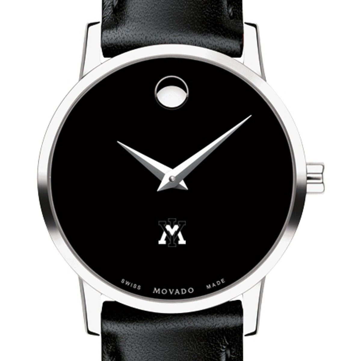 Virginia Military Institute Women's Movado Museum watch features the VMI Logo in full color at 6 o'clock on black dial. Created in 1947, the iconic concave dot symbolizes the sun at high-noon. Complimentary personal engraving.