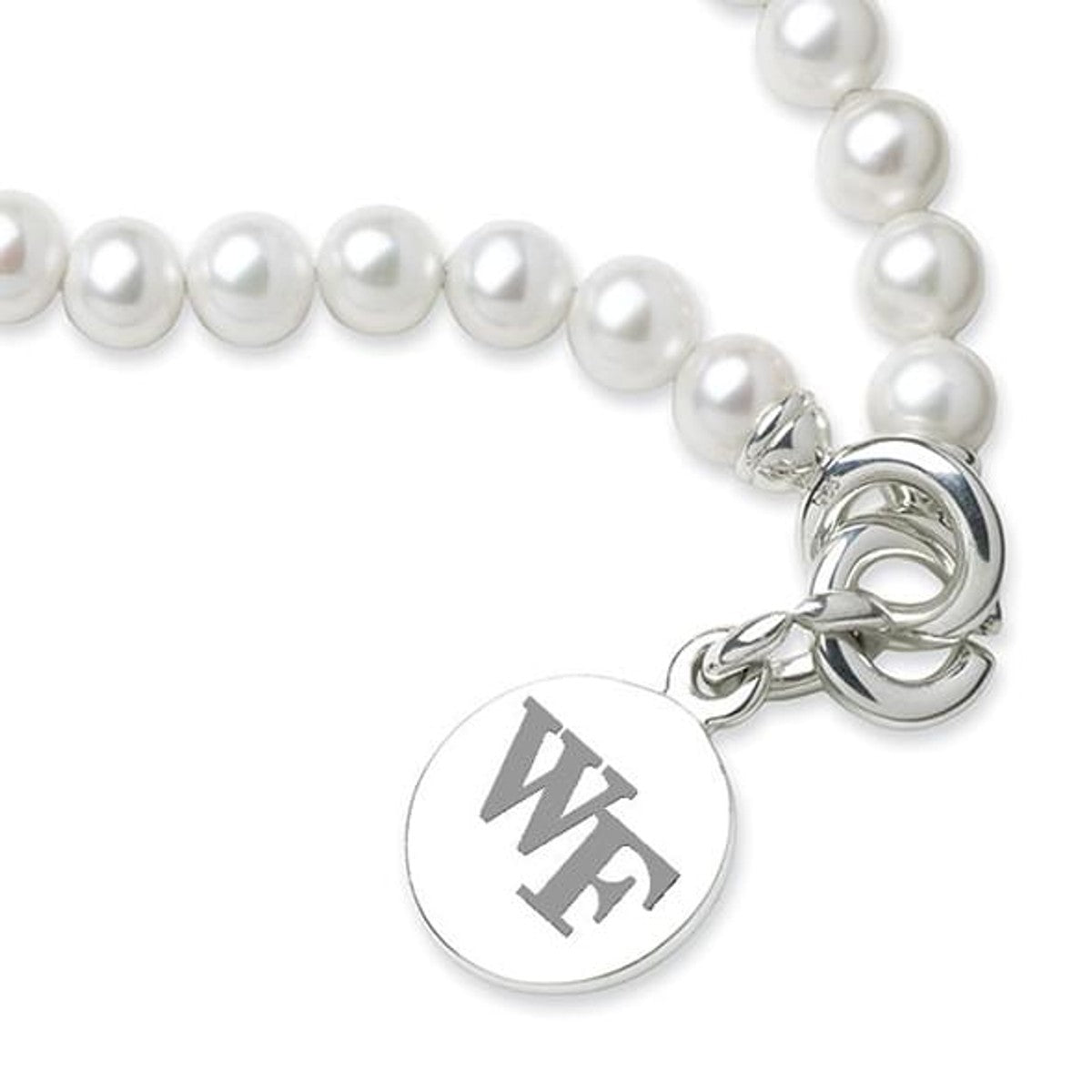 Wake Forest pearl bracelet and sterling silver Wake Forest charm features the Wake Forest logo delicately engraved on front and interlocking "C" clasp.