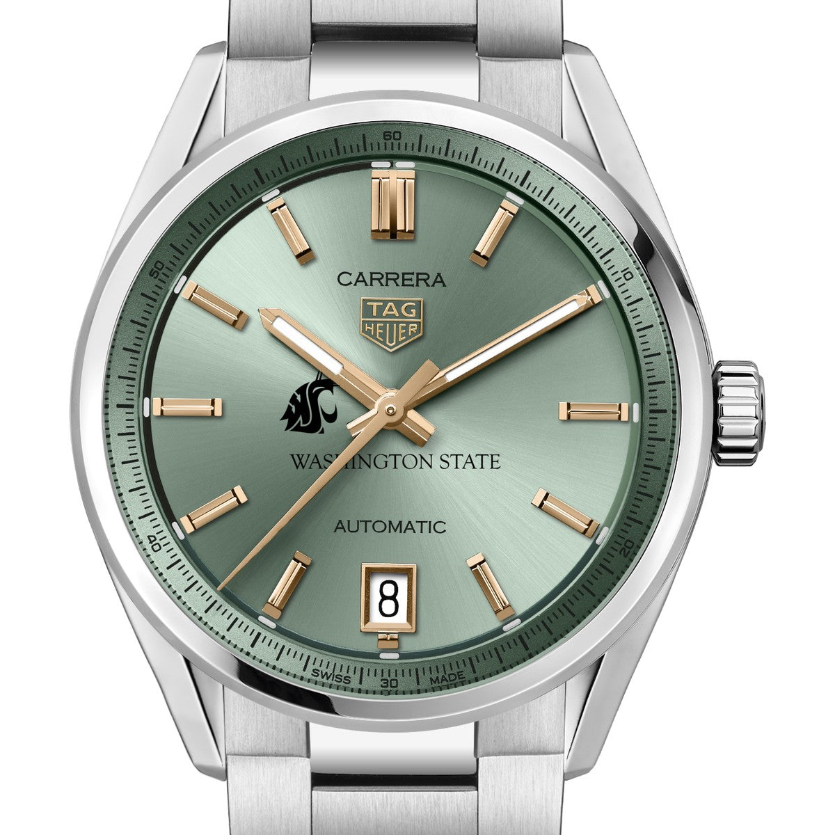 Explore the WSU Women's TAG Heuer Steel Carrera watch, featuring the Washington State Logo on a pastel green sunray brushed dial with 18K 5N rose gold-plated hands and indexes. Equipped with the Calibre 7 movement, it combines style and superior functionality. Complimentary personal engraving.