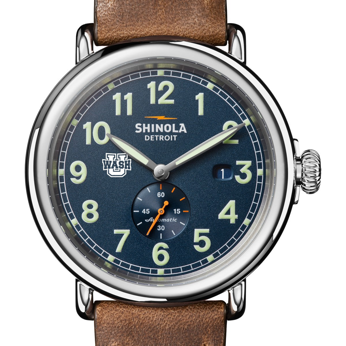Washington University in St. Louis Shinola Watch, The Runwell Automatic 45 mm Blue Dial and British Tan Strap at M.LaHart & Co.