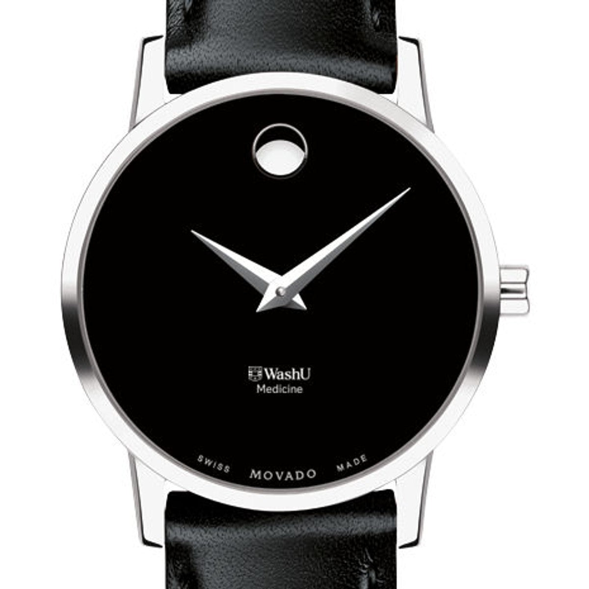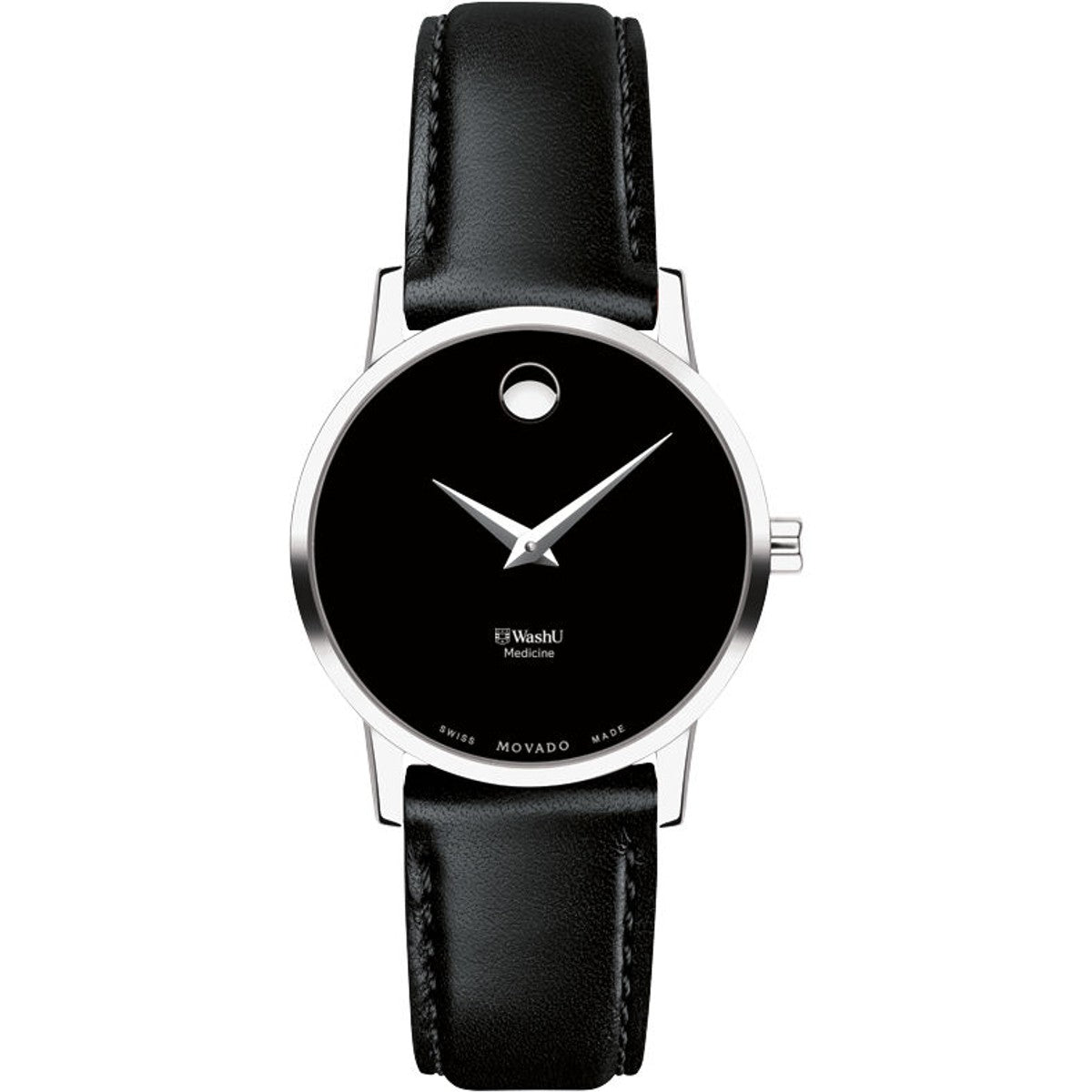 Washington University School of Medicine in St. Louis Women's Movado Museum watch features the WashU Medicine logo in full color at 6 o'clock on black dial. Created in 1947, the iconic concave dot symbolizes the sun at high-noon. Complimentary personal engraving.