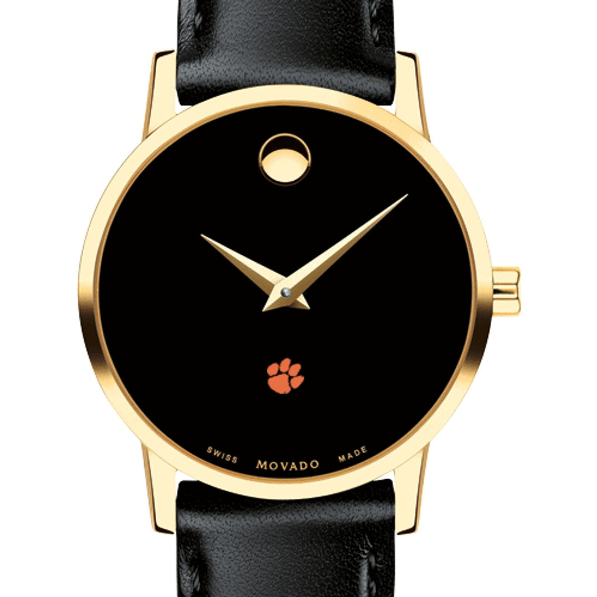 Clemson Women's Movado Museum watch features the Clemson Logo in full color at 6 o'clock on black dial. Created in 1947, the iconic concave dot symbolizes the sun at high-noon. Complimentary personal engraving.