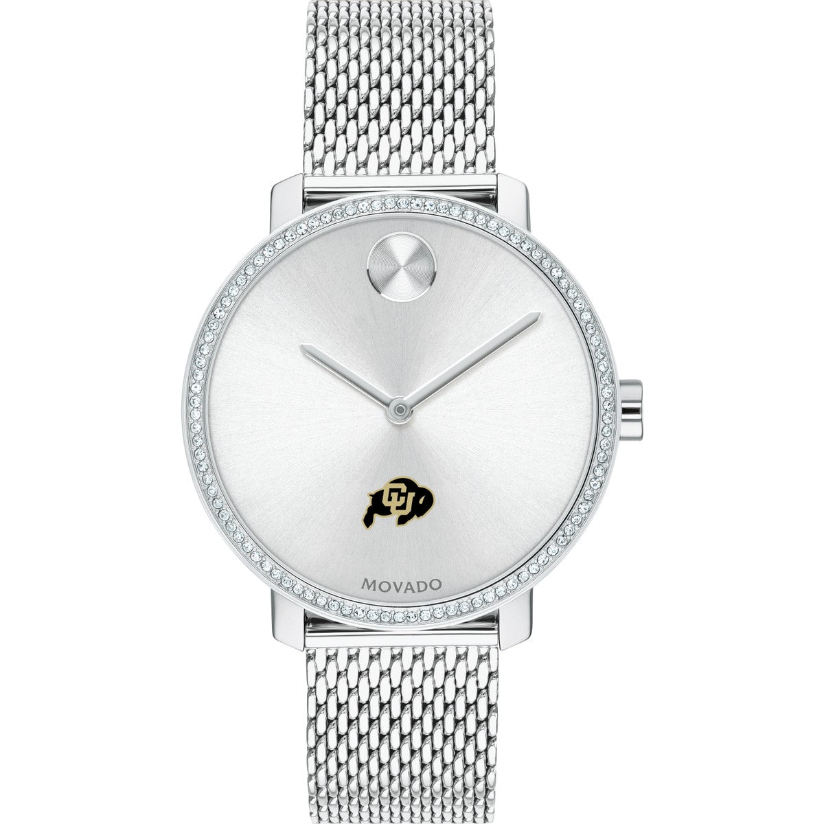 University of Colorado Women's Movado BOLD watch features the Colorado logo in full color at 6 o'clock on silver sunray dial.