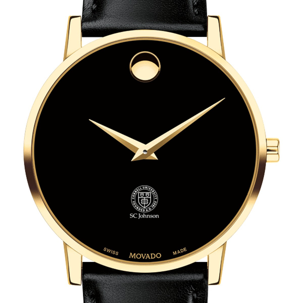 Cornell SC Johnson College of Business Men's Movado Museum watch features the SC Johnson College logo in full color at 6 o'clock on black dial. Created in 1947, the iconic concave dot symbolizes the sun at high-noon. Complimentary personal engraving.