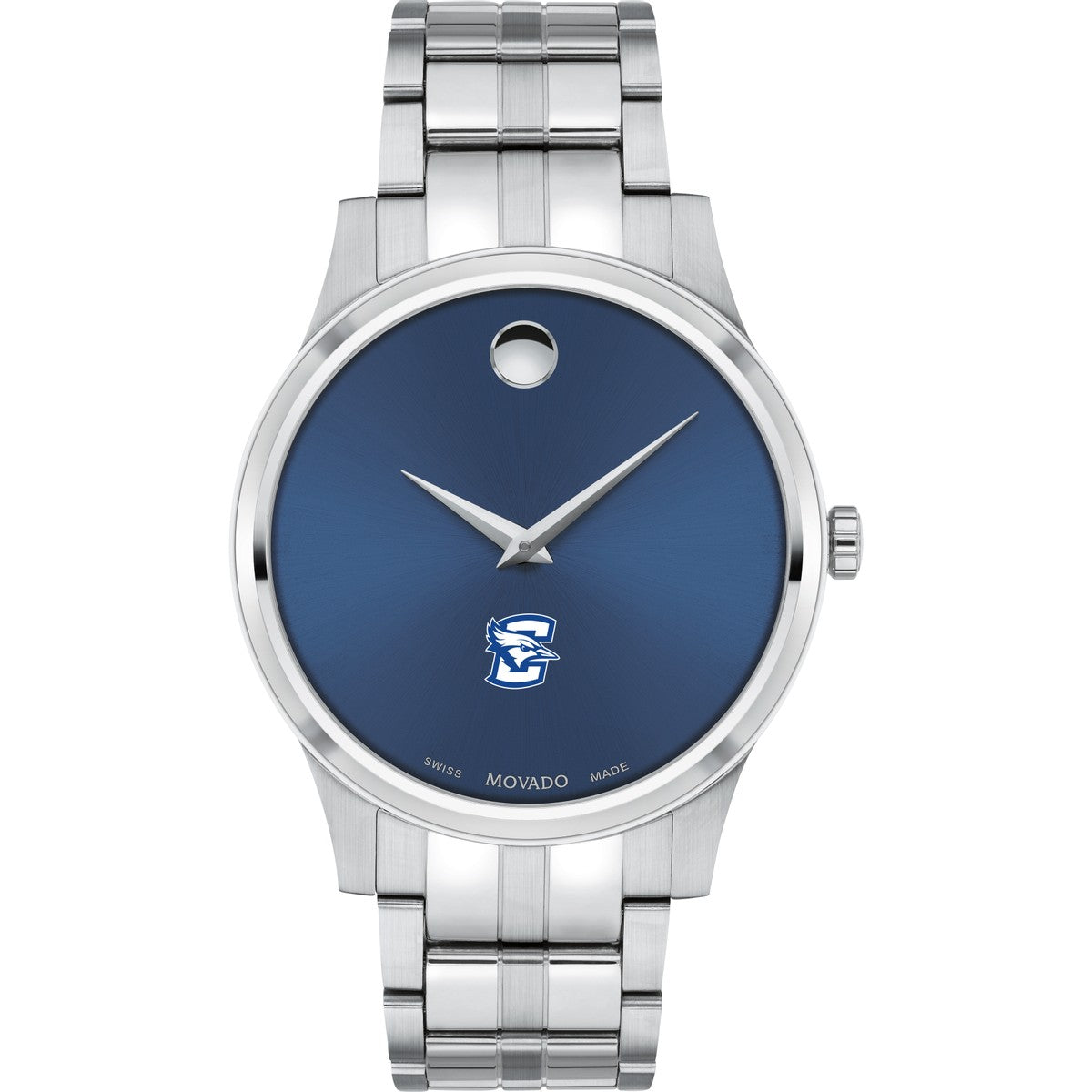 The Creighton University Men's Movado Collection watch boasts a striking blue dial featuring the iconic Creighton Logo in full color. This timeless timepiece, renowned for its concave dot representing the sun at high noon, has been a symbol of elegance since its inception in 1947. Make it uniquely yours with free engraving without affecting order processing time.