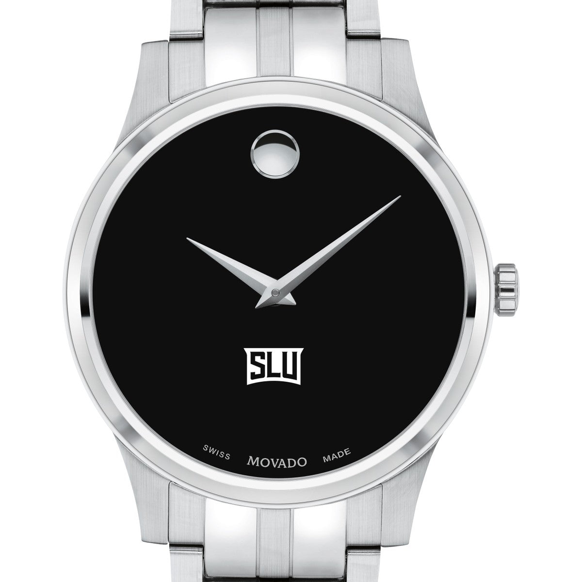 The Saint Louis University Men's Movado Collection watch showcases the iconic SLU logo in full color on a sophisticated black dial. This classic timepiece, featuring the renowned concave dot symbolizing the sun at high noon, has been a design masterpiece since its creation in 1947. Personalize your watch with free engraving without any delay to your order.