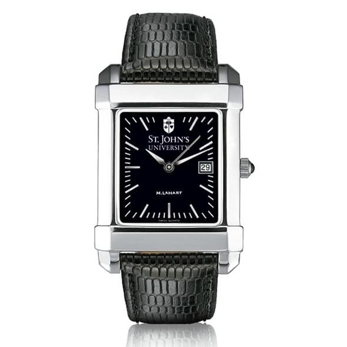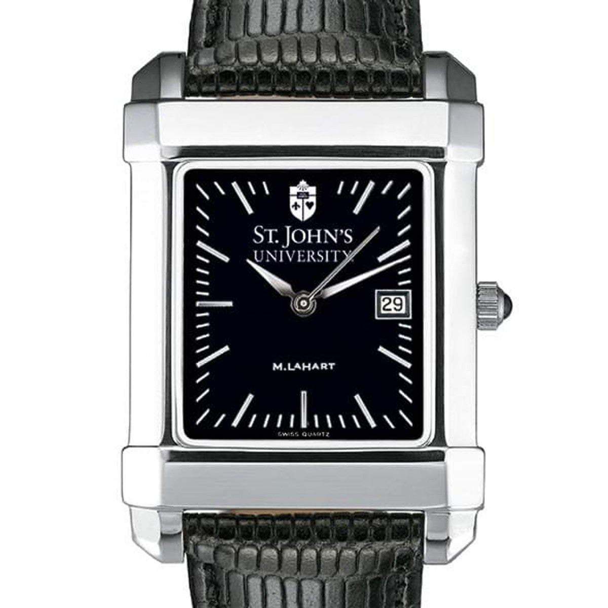 St. John's University men's steel watch featuring St. John's shield at 12 o'clock and "St. John's University" inscribed below on the black dial.
