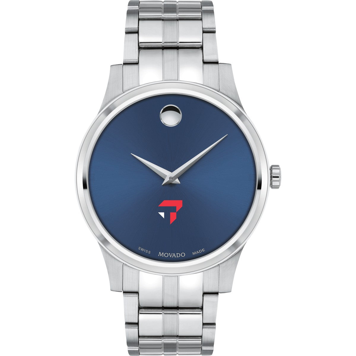 The Tepper School of Business Men's Movado Collection watch boasts a striking blue dial featuring the iconic Tepper logo in full color. This timeless timepiece, renowned for its concave dot representing the sun at high noon, has been a symbol of elegance since its inception in 1947. Make it uniquely yours with free engraving without affecting order processing time.