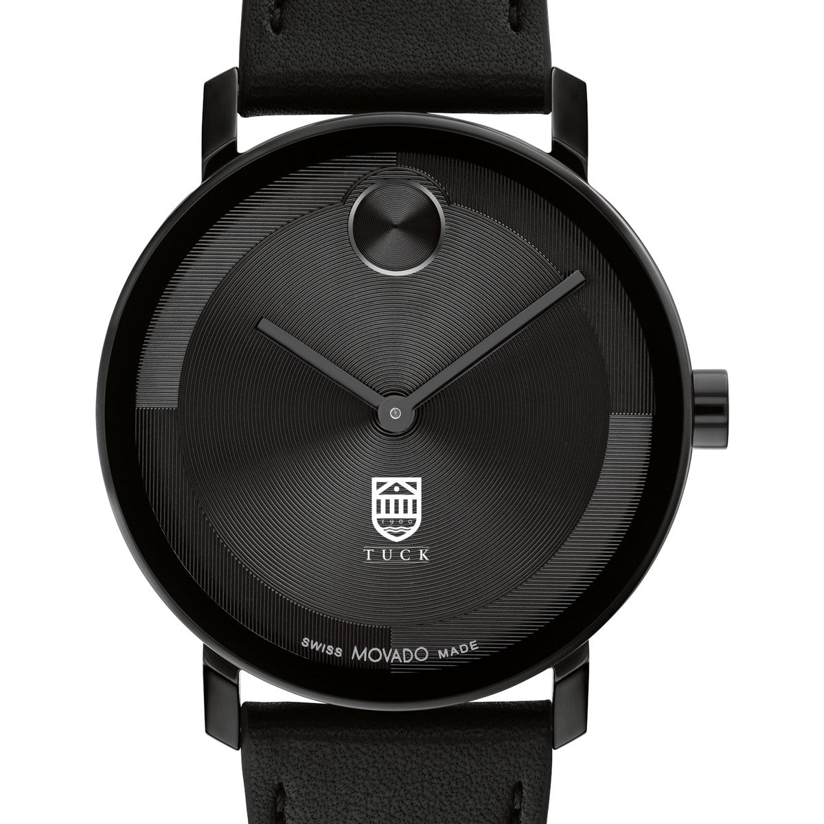 Adorned with the esteemed Tuck logo emblem, this Tuck School of Business Movado showcases a black Nappa leather strap and black ionic-plated steel case, embodying the essence of modern luxury. Complimentary personal engraving.