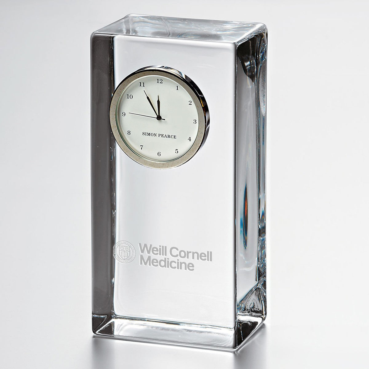 The Weill Cornell Tall Glass Desk Clock stands proudly on any surface, distinctly etched with the Weill Cornell logo. The clock showcases a traditional numbered face with a sweep hand to count the seconds.