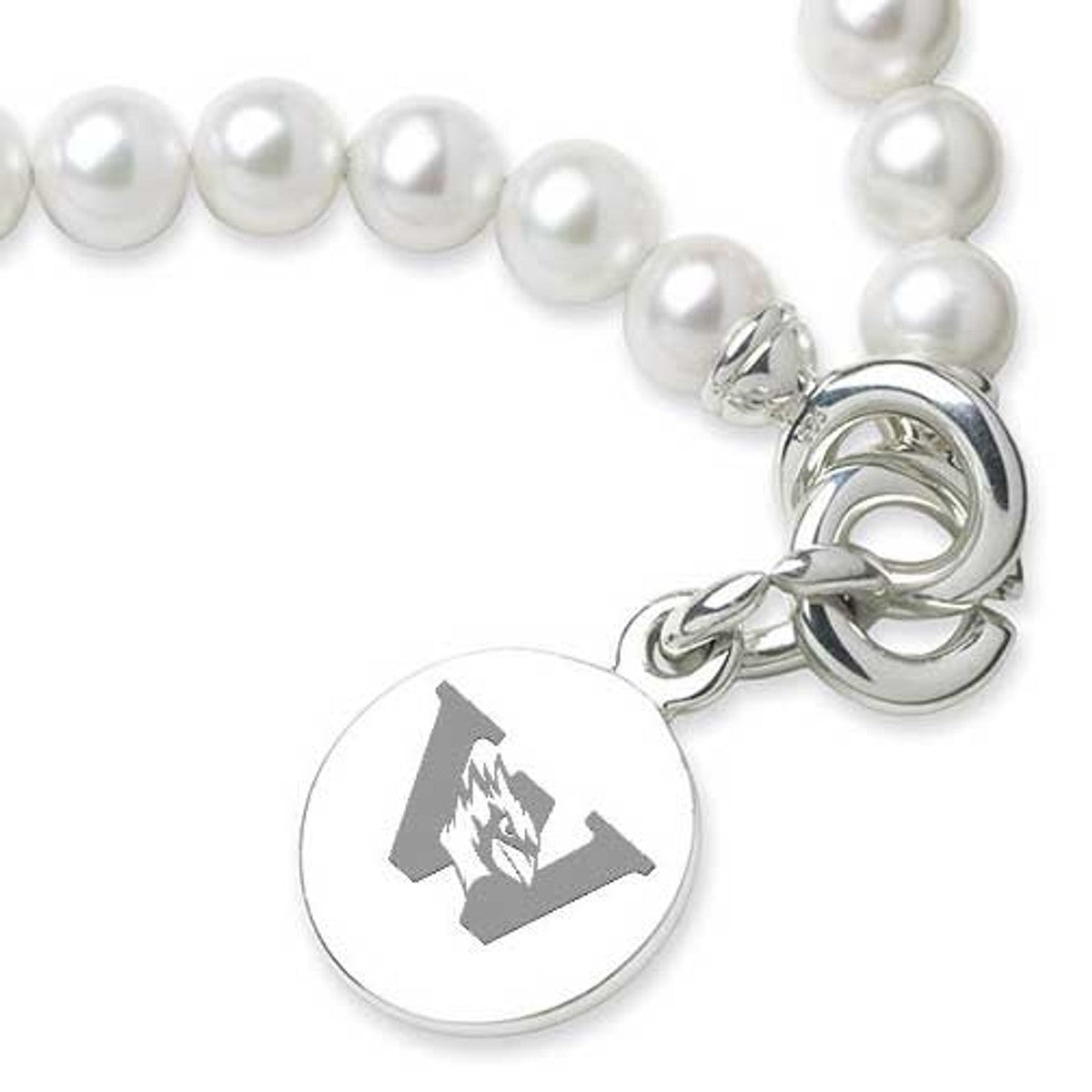 Wesleyan University pearl bracelet and sterling silver Wesleyan charm features the Wesleyan logo delicately engraved on front and interlocking "C" clasp.