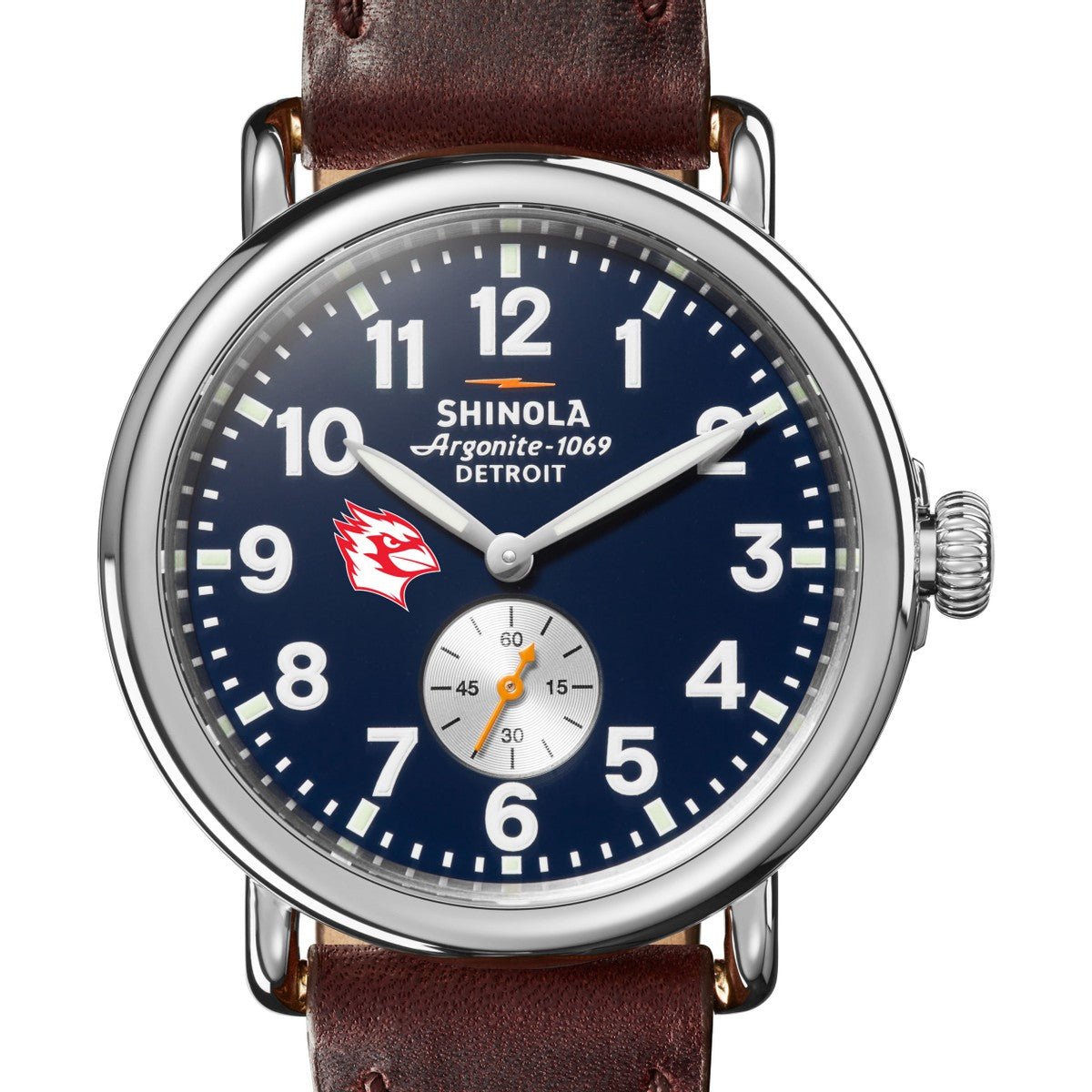 The Shinola Runwell features the Wesleyan logo in color on the handsome midnight blue dial with a 41 mm case in polished stainless steel for a classic look. Shinola's original flagship timepiece. Complimentary personal engraving