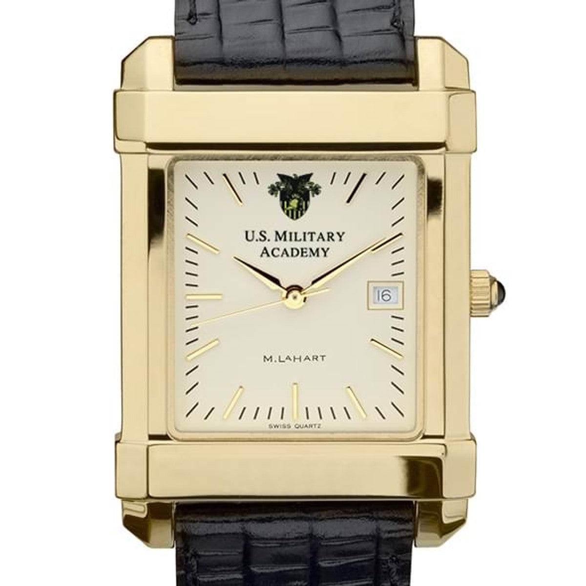 US Military Academy men's gold watch featuring the West Point Logo on cream dial. Free Engraving on all watches.