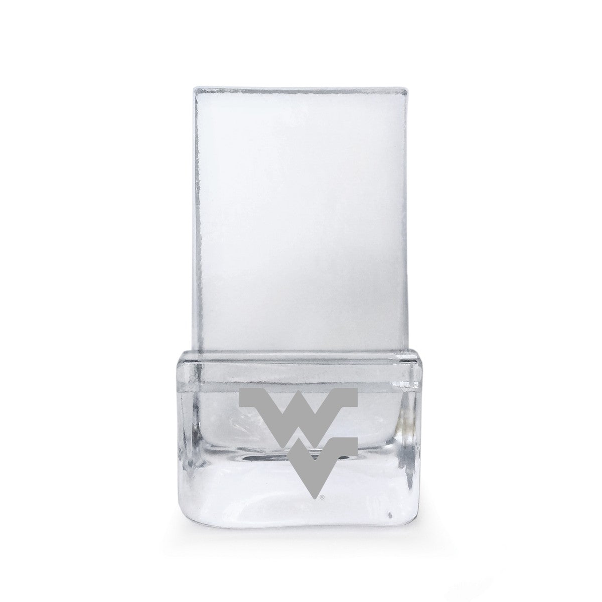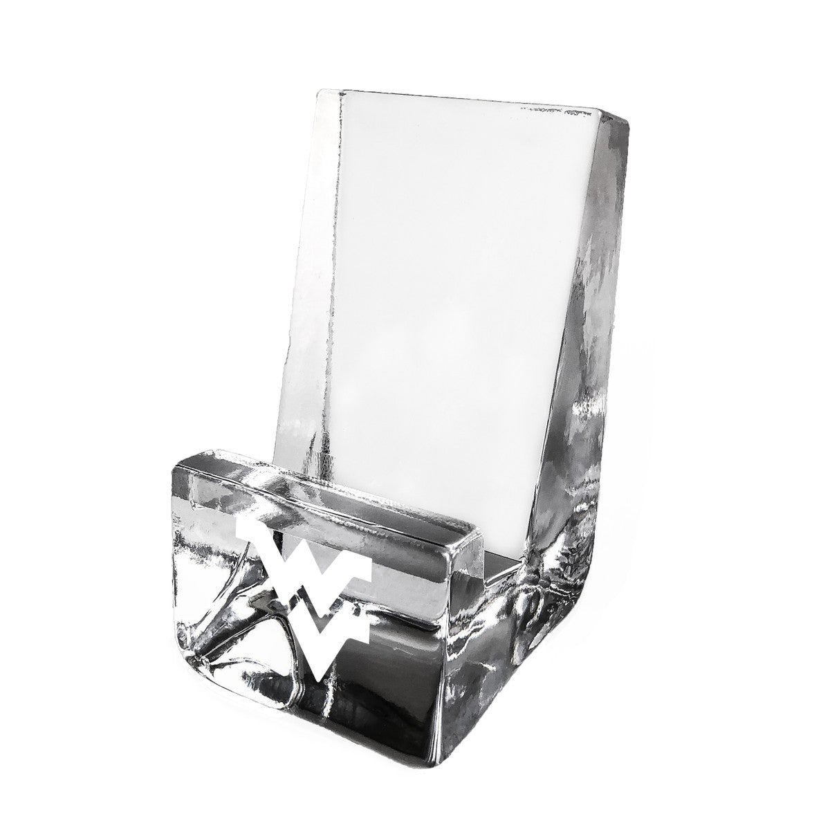 This handcrafted West Virginia University Glass Phone Holder is the perfect addition to your work or home environment. Formed from only the finest clear glass, the West Virginia logo is distinctly etched on the front.