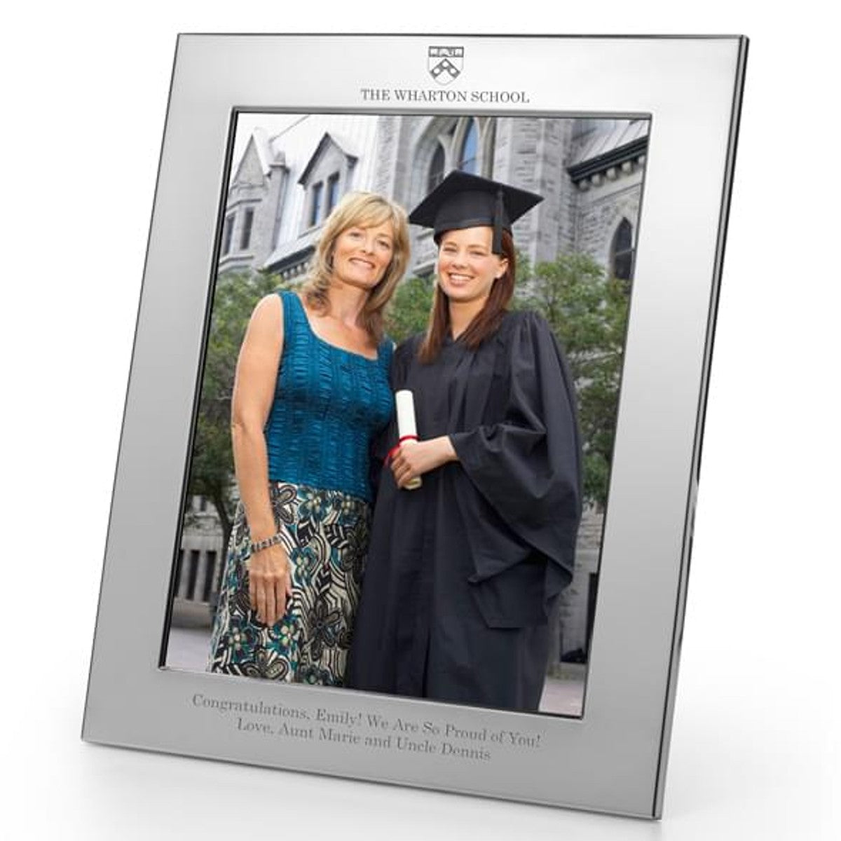 Handsomely engraved Wharton pewter frame, generously accommodates your custom-engraved personal message.