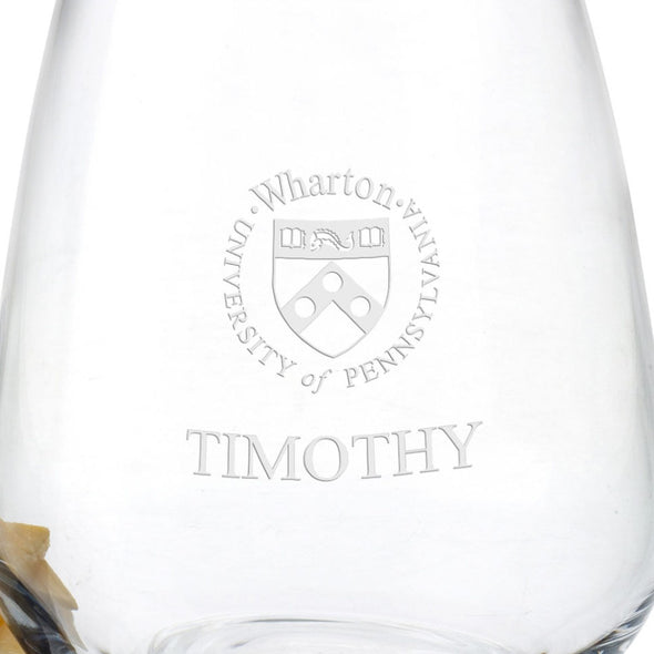 Contemporary Wharton stemless wine glasses bring an elegant touch to your table or bar. The Wharton Logo is deep-etched on each glass.